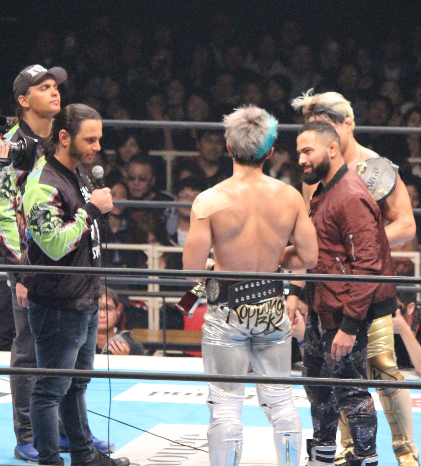 斎了「しゃべる準備してんのに写真撮ってんじゃねえよ! VerserK、オマエら帰れ。鷹木、オマエだけは待てコラ。中入れよ。鷹木は残ってもらうからちょっと待て。今日はな、オマエに試合を潰され、さんざん言われてよ。お笑いだなんだスタイルのことまでバカにされた。オマエに潰されたジミーズ、元メンバーがタイトルマッチに動いたり、みんなそれぞれ思いのまま気持ちのまま動いてる姿をオレは見てたよ。オレは何もなかった。だからこないだ、チャンスがあればどんどん攻めて行くってリング上で言った。攻めてくぞ。オレのターゲット、標的は、鷹木オマエだ!」鷹木「斎藤了、わかったわかった。とりあえず、オレも首が痛いからその話は次にしてくれ」
