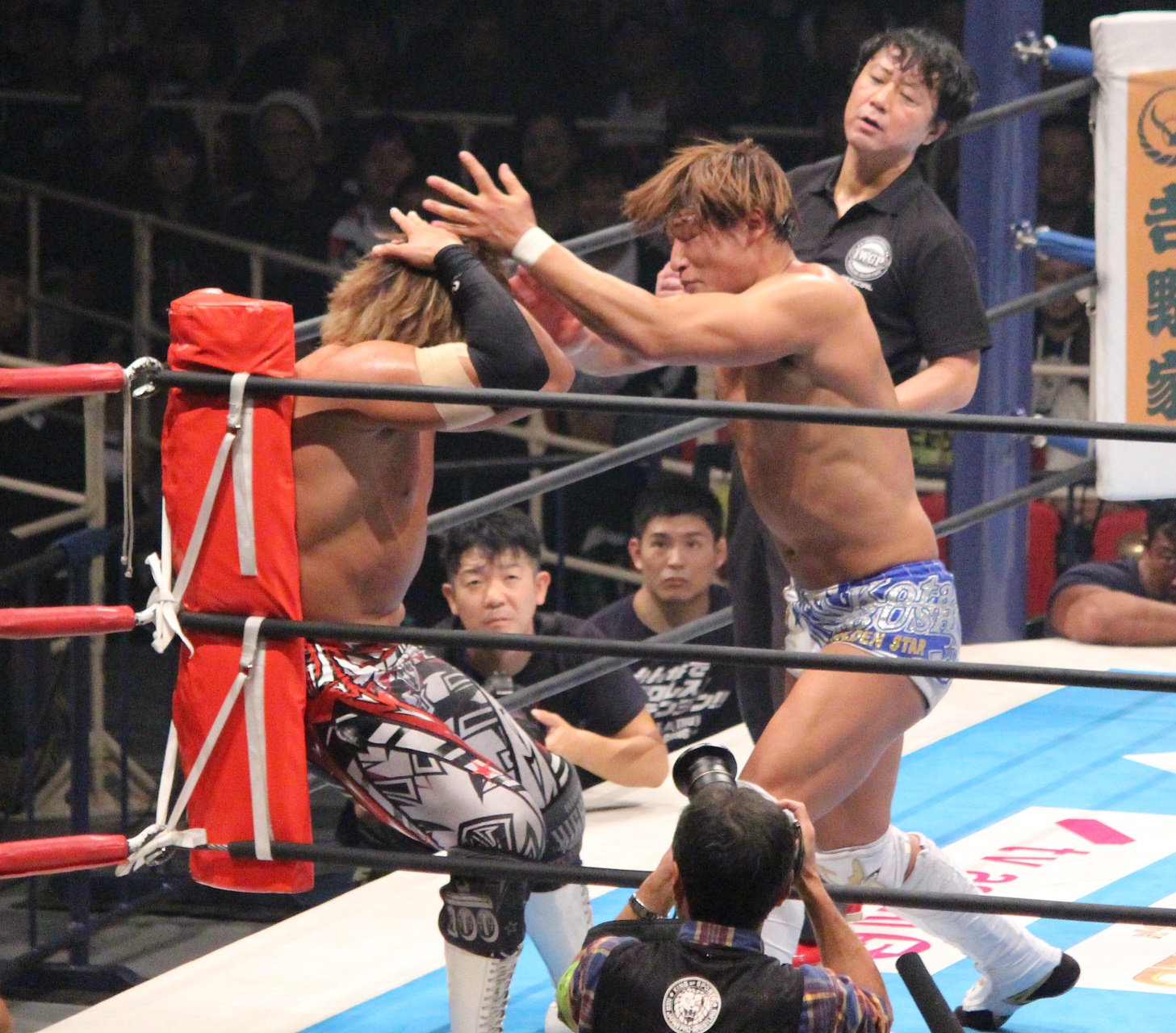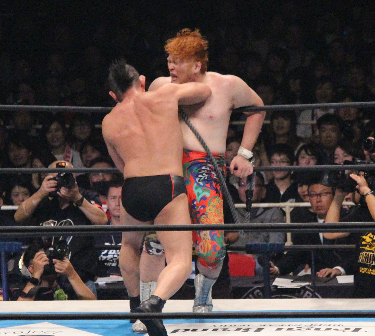 先手を奪われた王者組だったが丸藤が逆水平を放ってくる高梨に、鞭のようにしなる逆水平で一閃すると、セカンドロープに宙吊りにしてのフットスタンプ、フットスタンプと高梨のボディーを狙い撃ちにすれば、丸藤もネックツイストから首攻めを展開、坂口がカットに入るが、丸藤と睨み合いとなるも、HARASHIMAとの連係で徹底的に高梨を痛めつける。