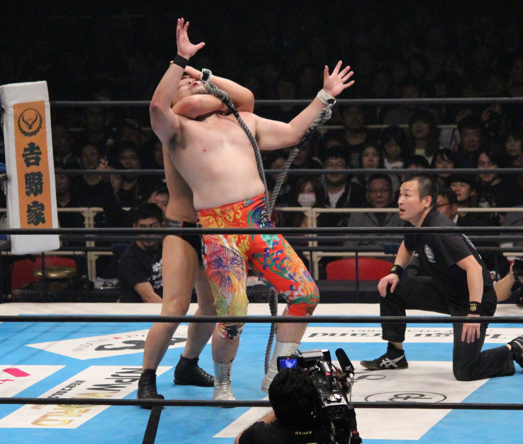丸藤は勝負を託された高梨に前へ投げてからのトラースキックを放つも、不知火狙いは高梨が回転途中で踏ん張り、コーナーで丸藤を固定してから坂口がコナーからの地獄の断頭台投下すると、高梨はタカタニック狙いは、丸藤が切り返すが、援護を狙ったHARASHIMAの蒼魔刀が丸藤に誤爆すると、高梨は丸め込みを連発してからタカタニックを狙う。しかし全て凌いだ丸藤が見えない角度からのトラースキック、HARASHIMAのその場飛び蒼魔刀、丸藤の不知火と波状攻撃で3カウントを奪い王座を防衛、試合後も丸藤が坂口との一騎打ちを要求すれば、セコンドに着いていたKUDOも丸藤に対戦をアピールした。