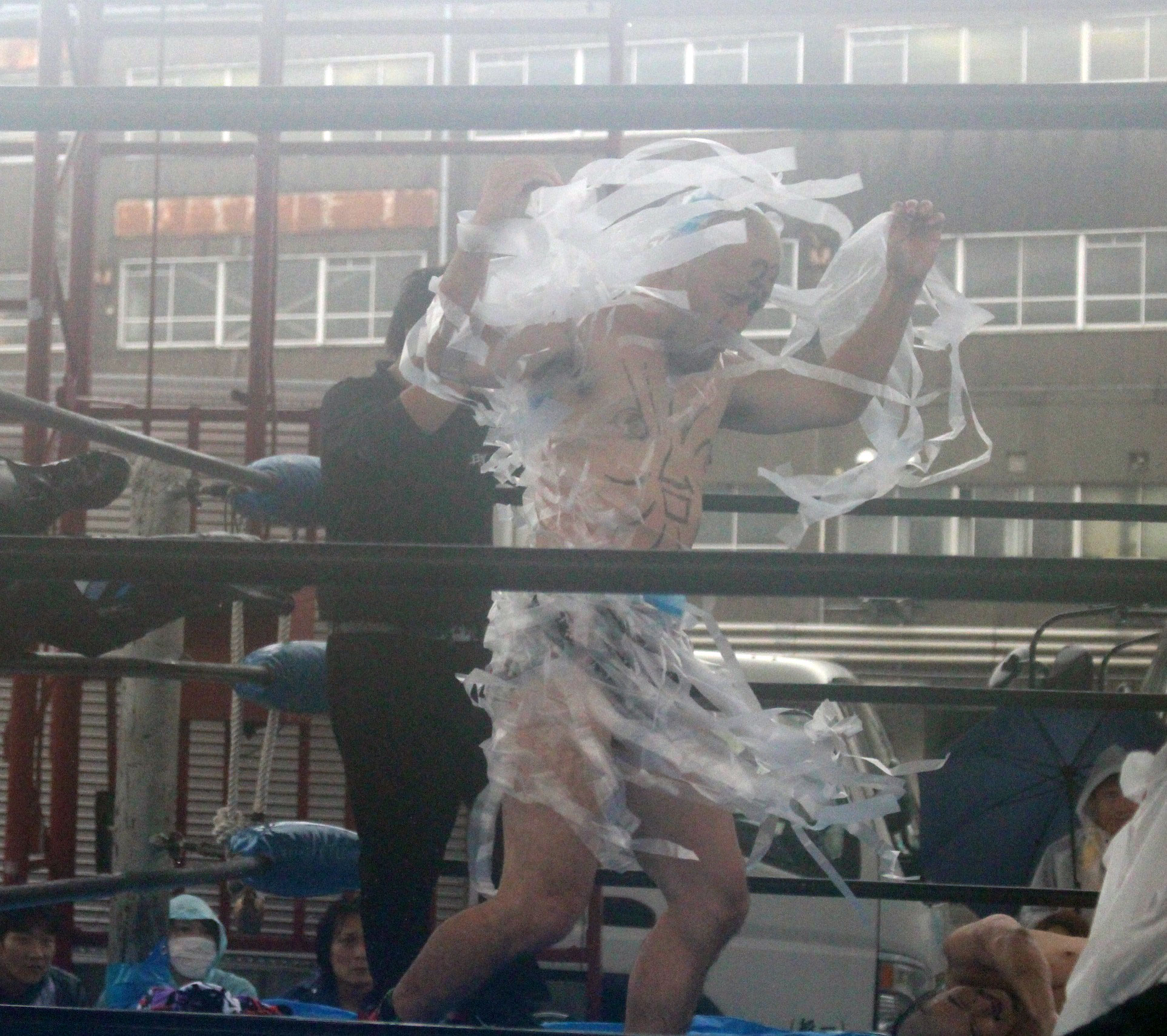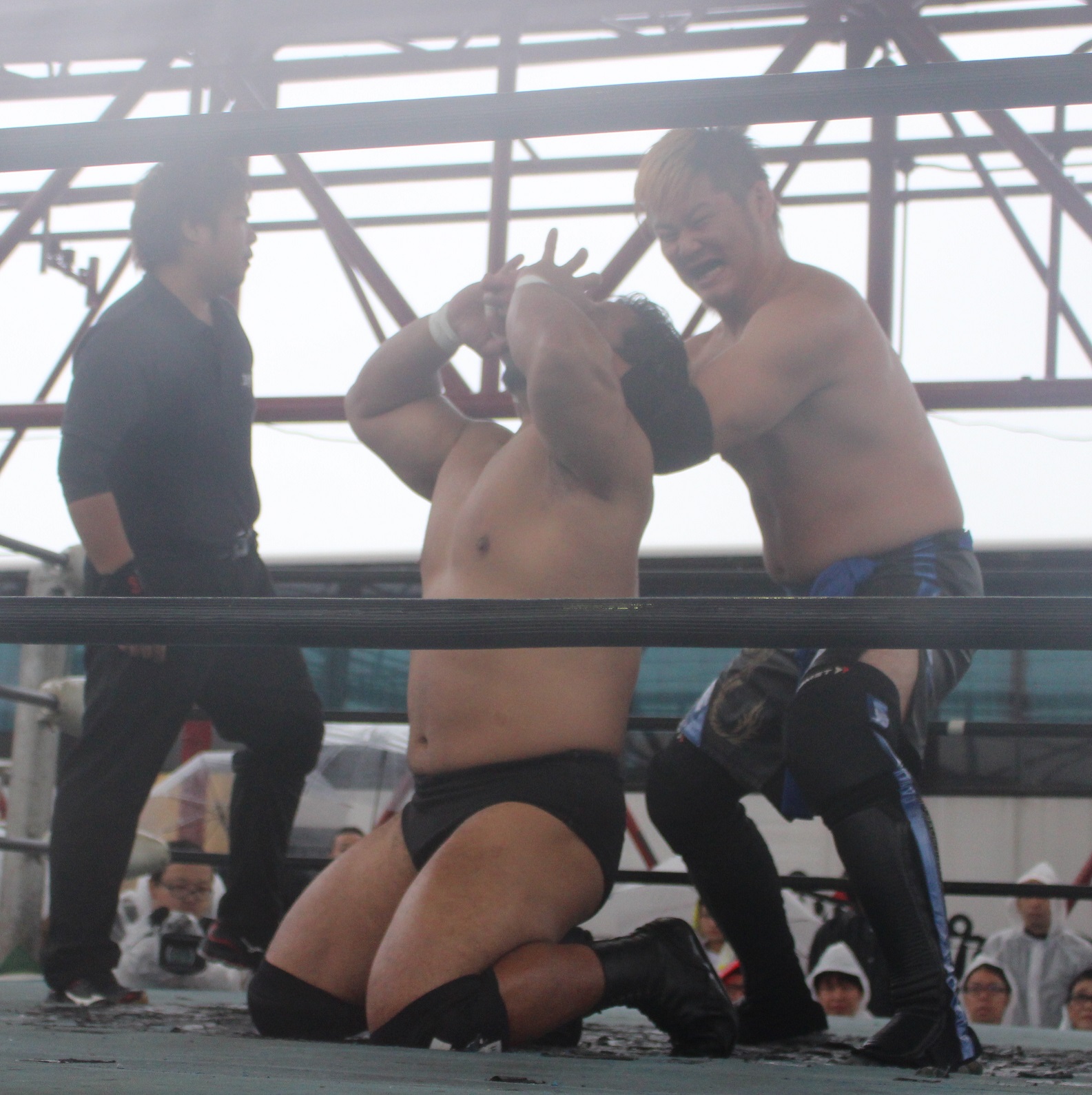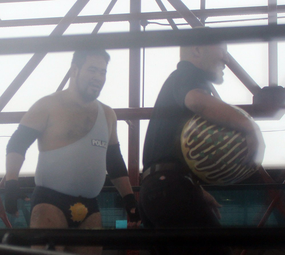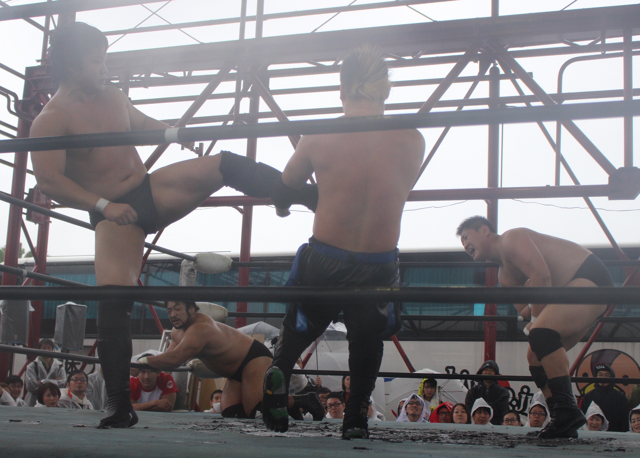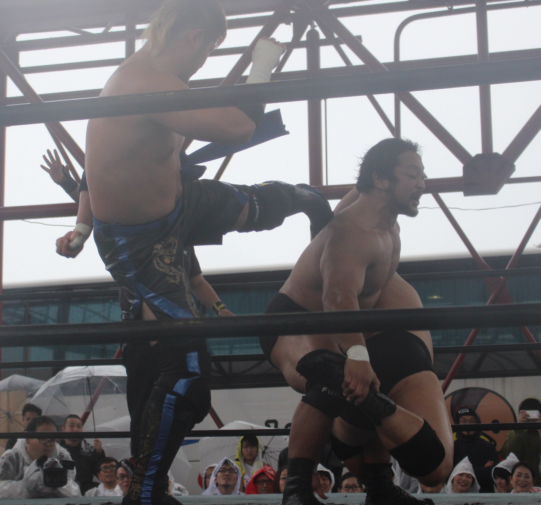 場外戦で藤田が鉄柱攻撃から蛍光灯攻撃、リングに戻ってから後頭部への低空ドロップキックで攻勢も、ラダーへの蛍光灯狙いは竹田が投げて藤田が直撃、竹田はナイフを持ち出して藤田の額を切り刻み、背中に蛍光灯を挟んでエルボーでクラッシュ、膝蹴り、顔面整形、場外櫓へのブレーンバスター狙いは藤田が阻止して突進も、竹田はスピアーで迎撃、しかし藤田も反撃してカッターテーブルへのリバースタイガードライバーを狙うが、竹田はリバースも、藤田はもう一度リバースタイガードライバーで抱えてから背中からノコギリテーブルに叩きつける。