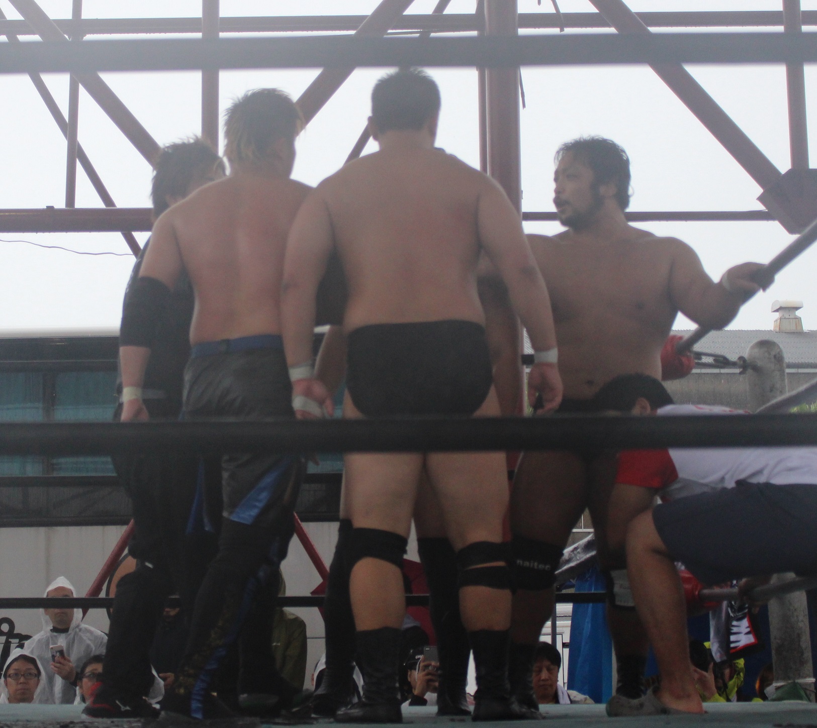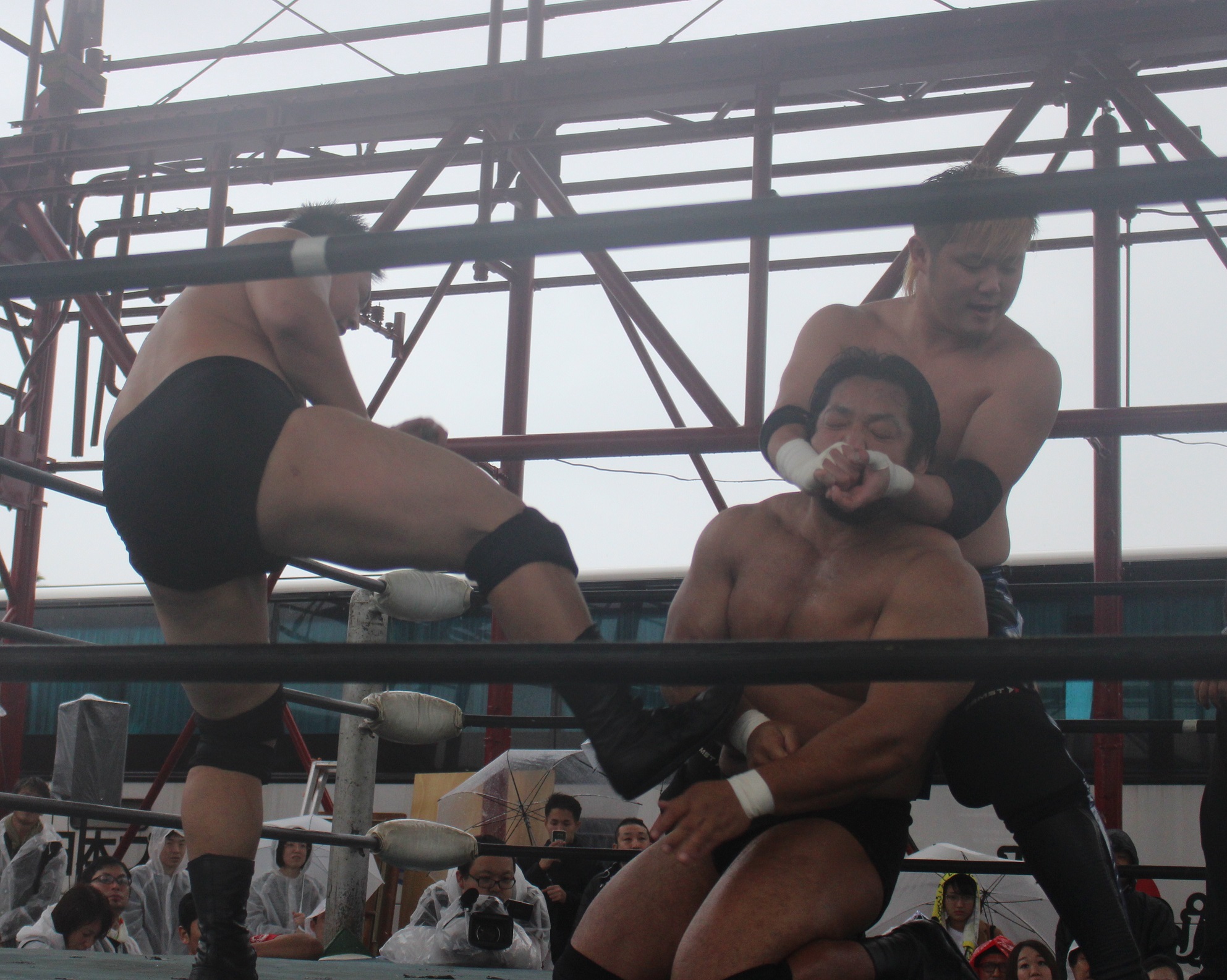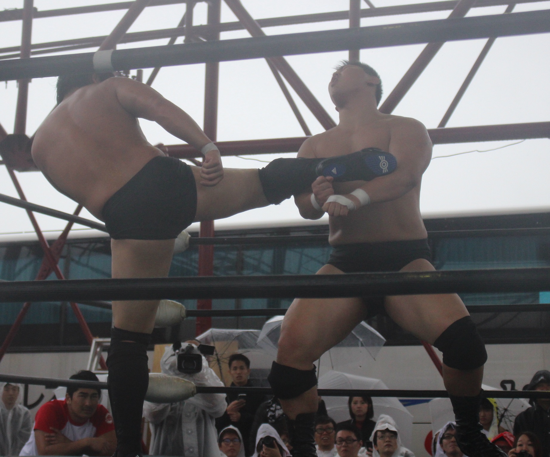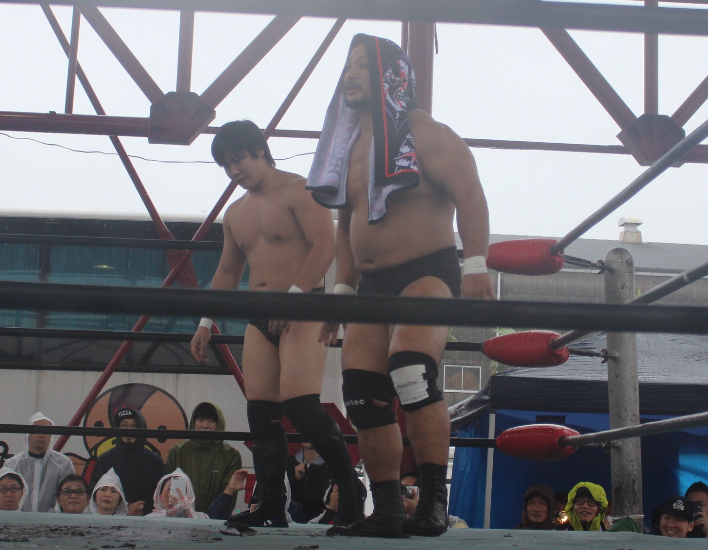場外戦で藤田が鉄柱攻撃から蛍光灯攻撃、リングに戻ってから後頭部への低空ドロップキックで攻勢も、ラダーへの蛍光灯狙いは竹田が投げて藤田が直撃、竹田はナイフを持ち出して藤田の額を切り刻み、背中に蛍光灯を挟んでエルボーでクラッシュ、膝蹴り、顔面整形、場外櫓へのブレーンバスター狙いは藤田が阻止して突進も、竹田はスピアーで迎撃、しかし藤田も反撃してカッターテーブルへのリバースタイガードライバーを狙うが、竹田はリバースも、藤田はもう一度リバースタイガードライバーで抱えてから背中からノコギリテーブルに叩きつける。