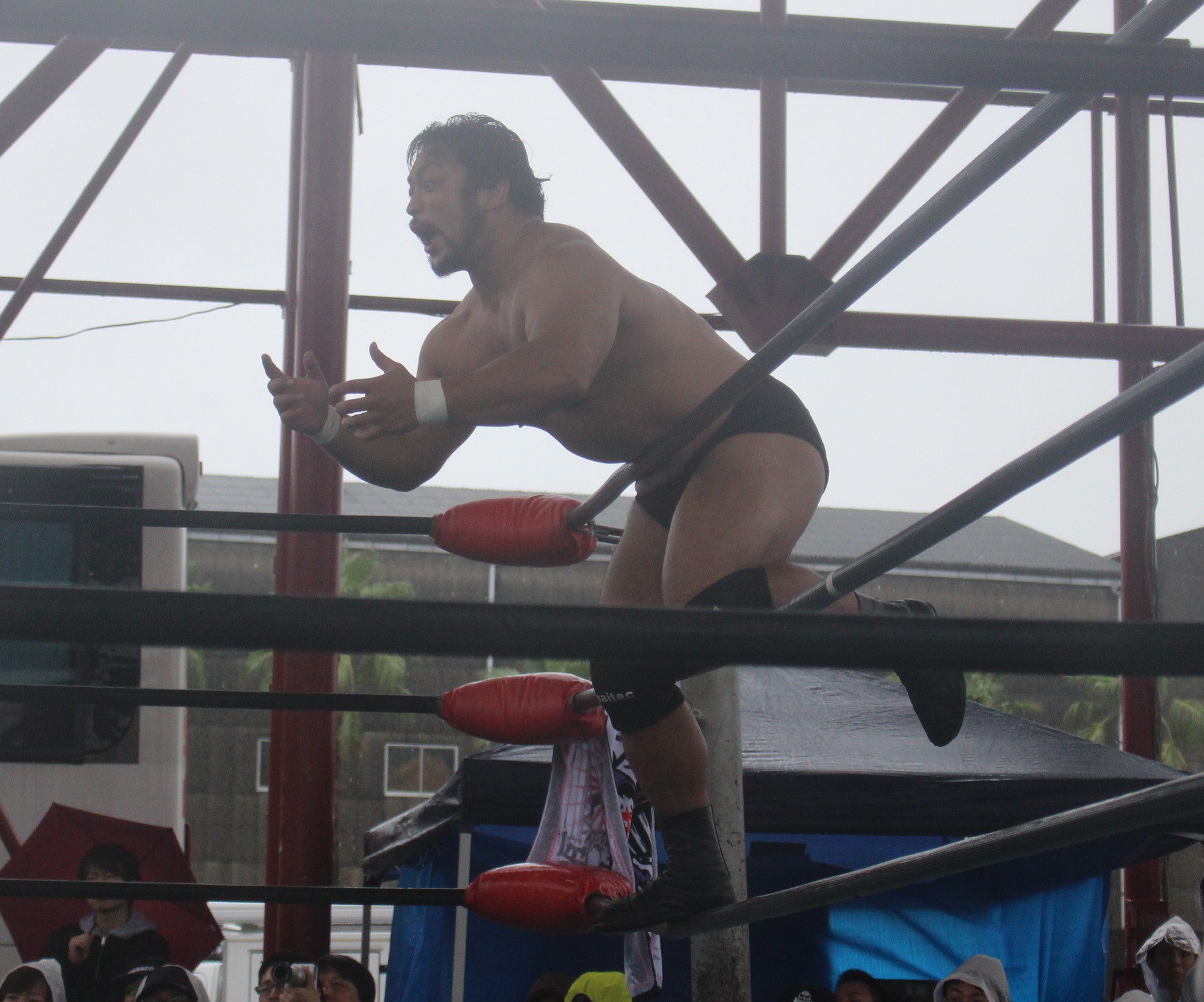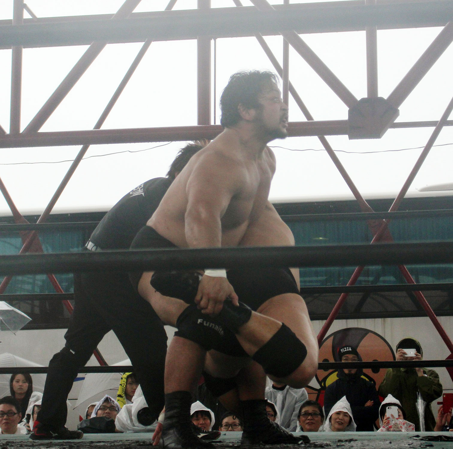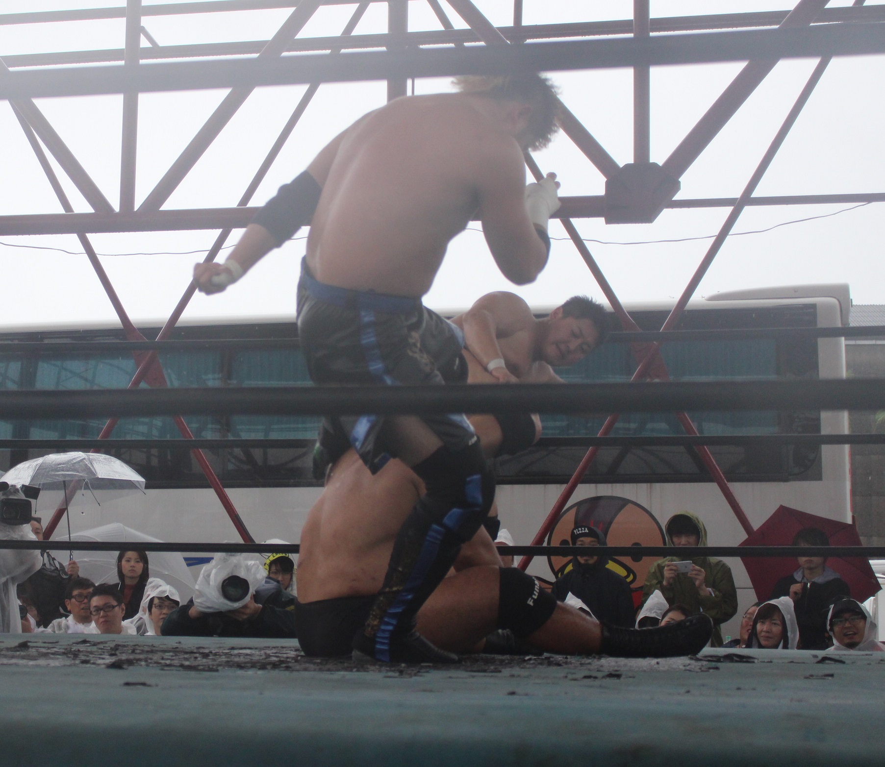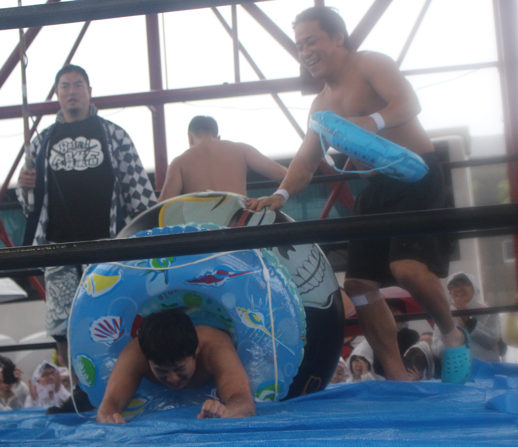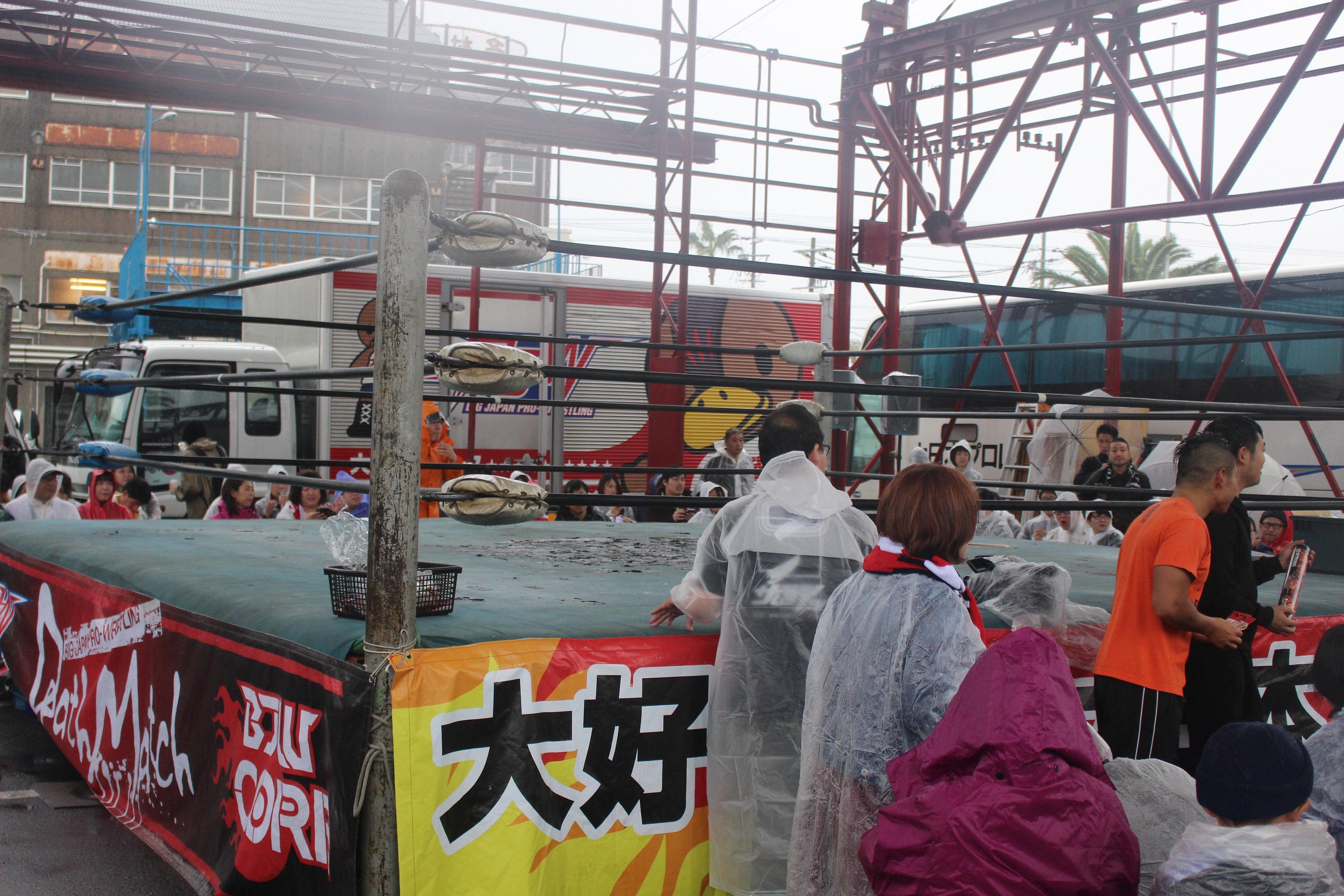 場外戦で藤田が鉄柱攻撃から蛍光灯攻撃、リングに戻ってから後頭部への低空ドロップキックで攻勢も、ラダーへの蛍光灯狙いは竹田が投げて藤田が直撃、竹田はナイフを持ち出して藤田の額を切り刻み、背中に蛍光灯を挟んでエルボーでクラッシュ、膝蹴り、顔面整形、場外櫓へのブレーンバスター狙いは藤田が阻止して突進も、竹田はスピアーで迎撃、しかし藤田も反撃してカッターテーブルへのリバースタイガードライバーを狙うが、竹田はリバースも、藤田はもう一度リバースタイガードライバーで抱えてから背中からノコギリテーブルに叩きつける。