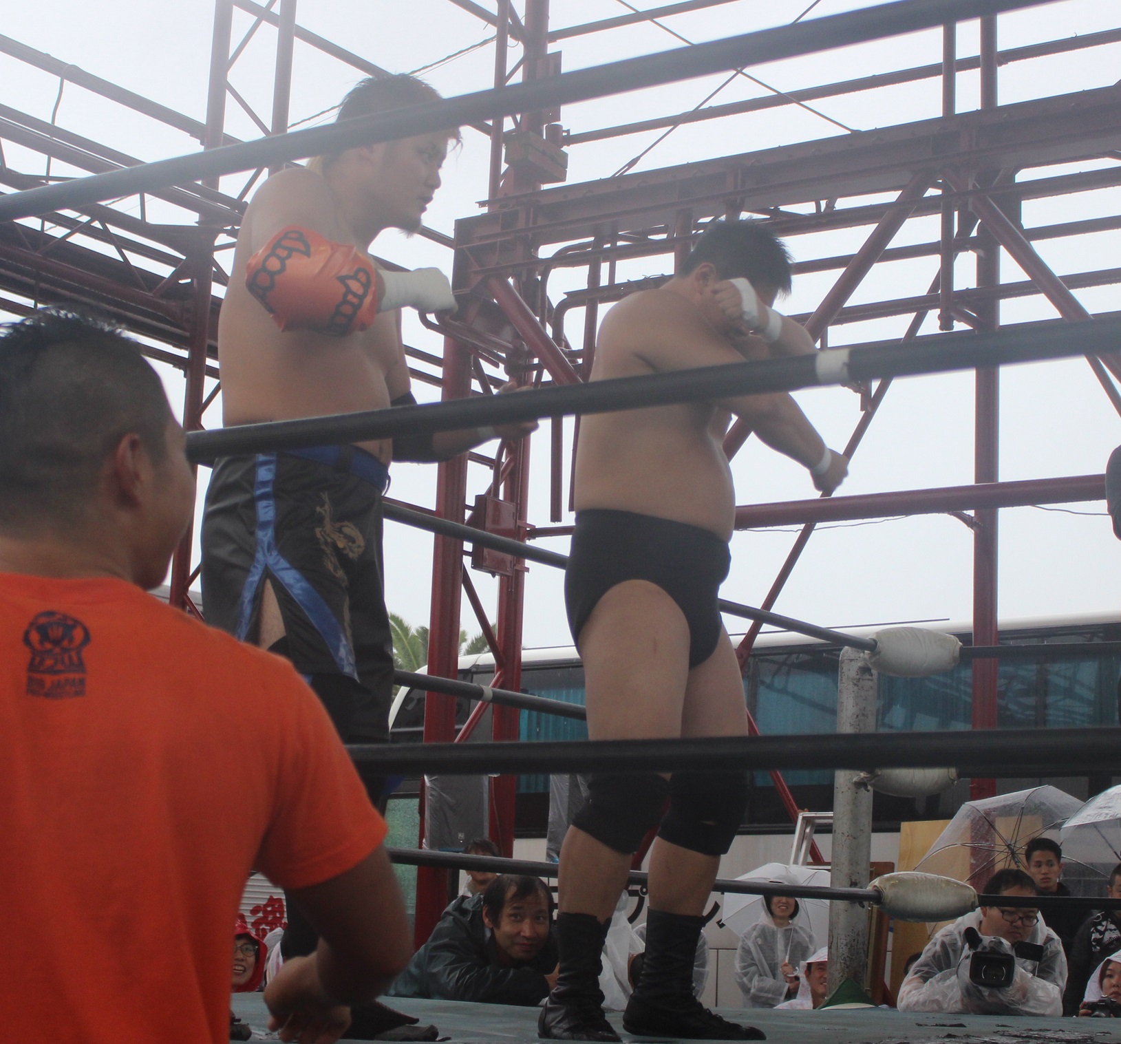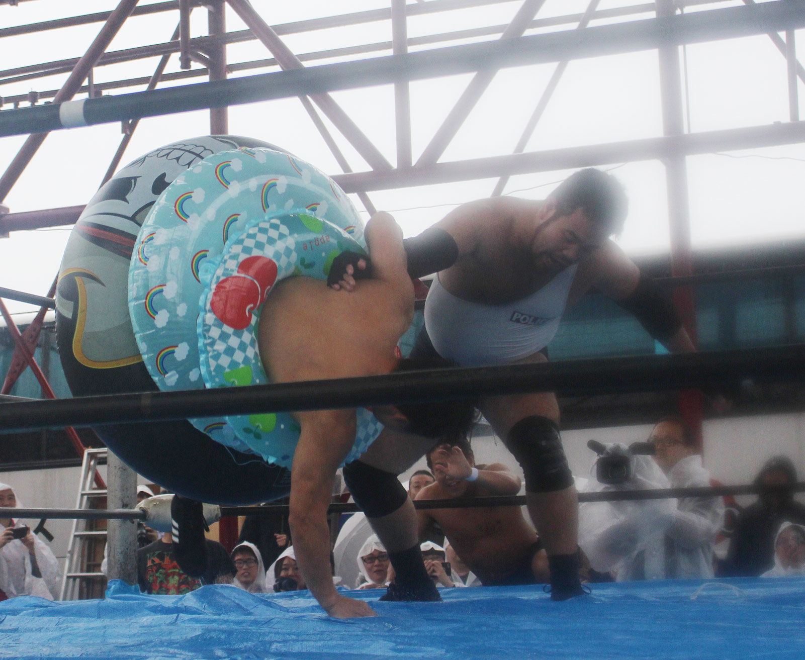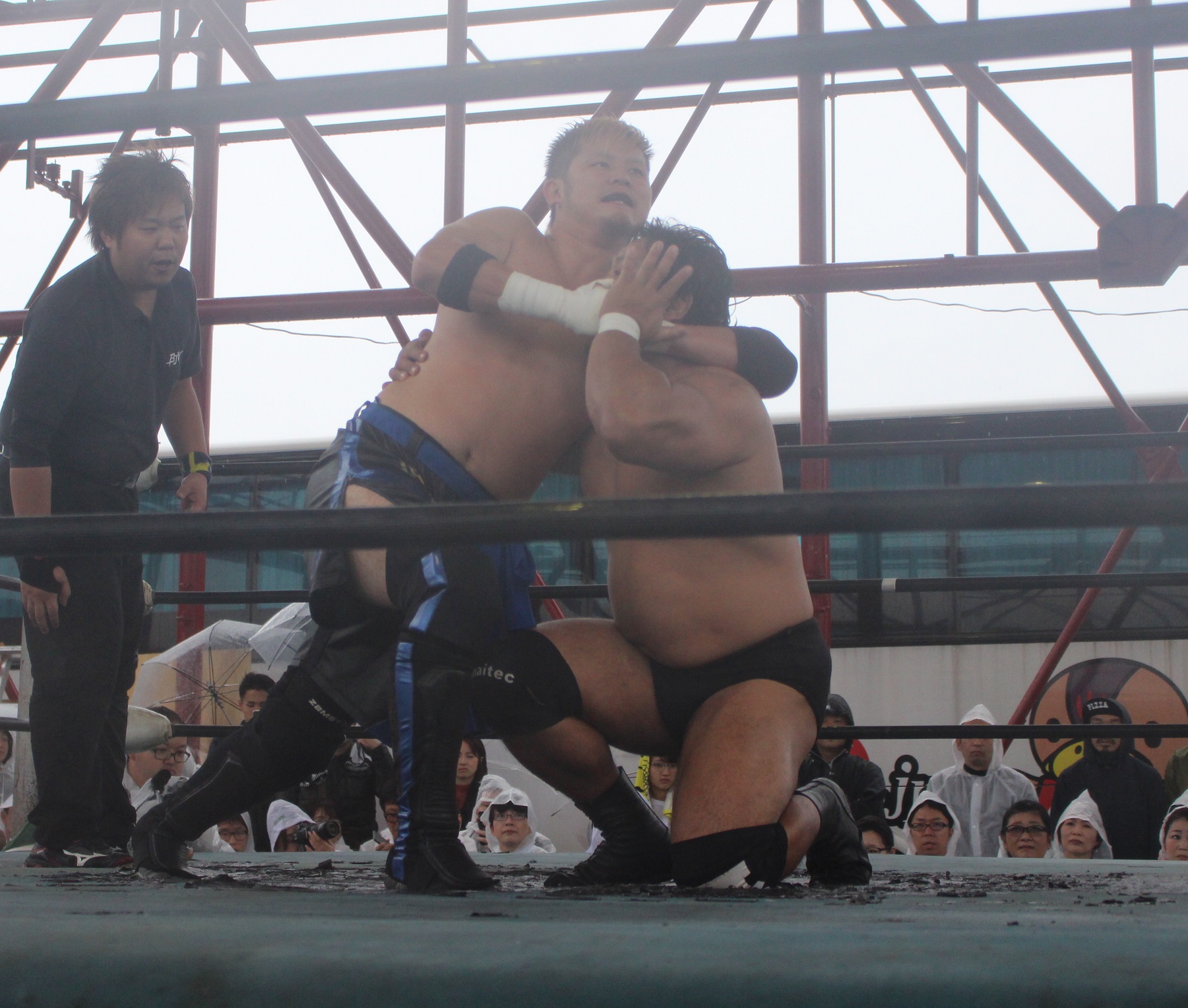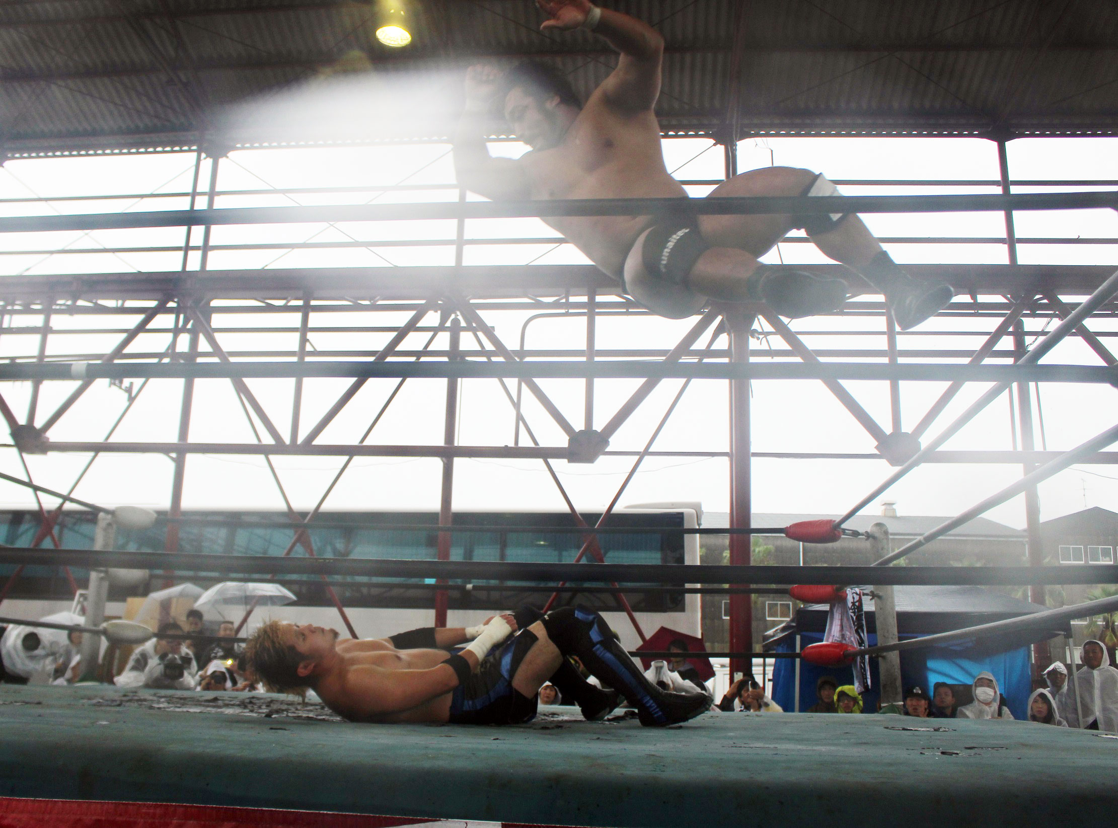 場外戦で藤田が鉄柱攻撃から蛍光灯攻撃、リングに戻ってから後頭部への低空ドロップキックで攻勢も、ラダーへの蛍光灯狙いは竹田が投げて藤田が直撃、竹田はナイフを持ち出して藤田の額を切り刻み、背中に蛍光灯を挟んでエルボーでクラッシュ、膝蹴り、顔面整形、場外櫓へのブレーンバスター狙いは藤田が阻止して突進も、竹田はスピアーで迎撃、しかし藤田も反撃してカッターテーブルへのリバースタイガードライバーを狙うが、竹田はリバースも、藤田はもう一度リバースタイガードライバーで抱えてから背中からノコギリテーブルに叩きつける。