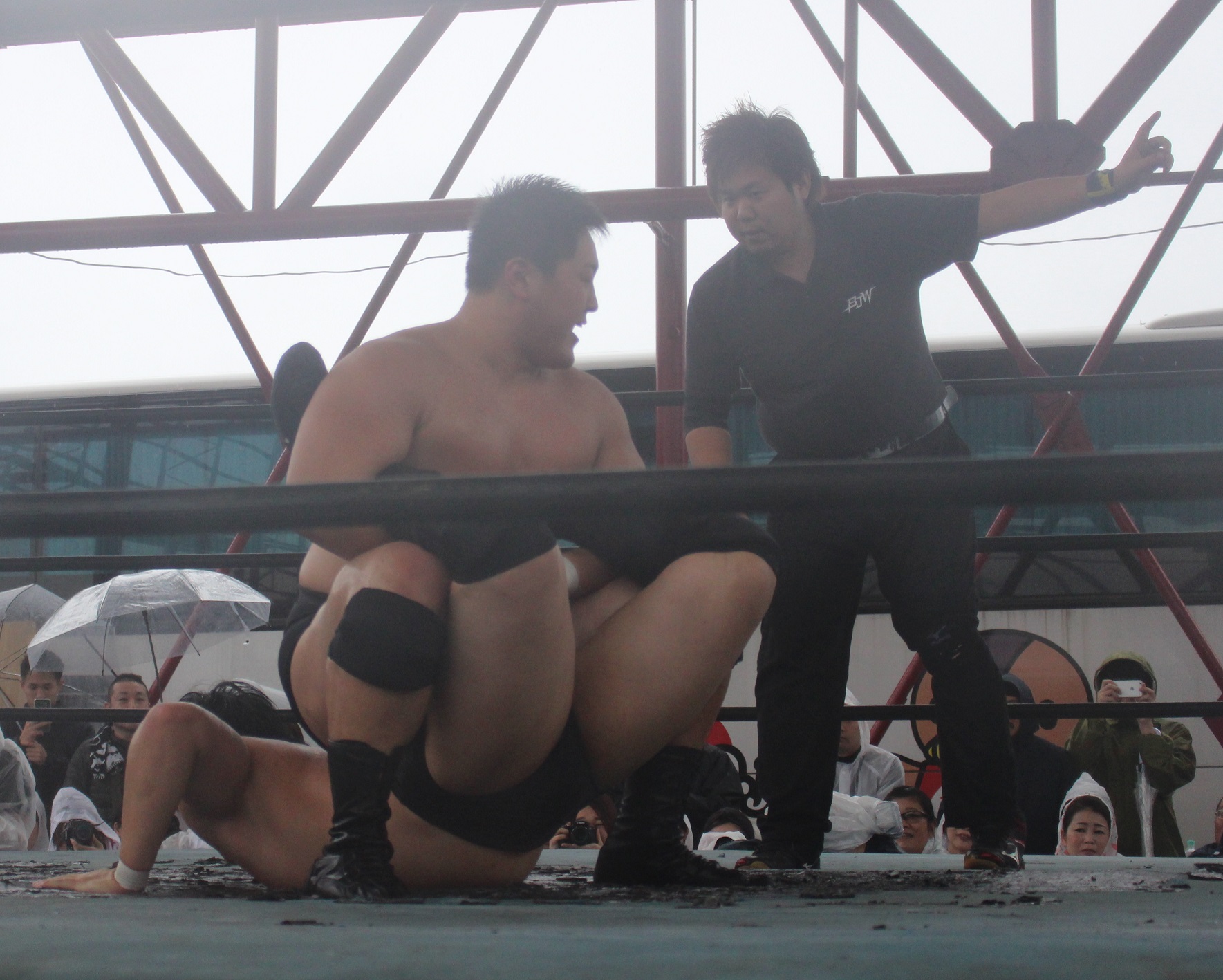 (BJWのテーマが鳴ってエンディングと思いきや、高橋匡哉が乱入。竹田に蛍光灯攻撃を見舞い、フェースバスターで叩きつけ場内ブーイング)