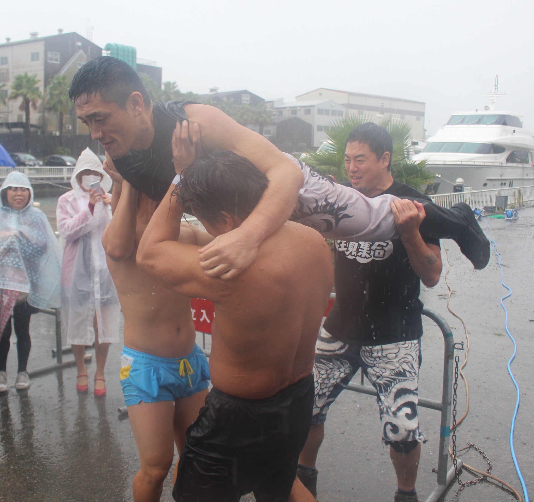 起き上がった両者はエルボー、張り手合戦と打撃戦となり、竹下が競り勝ったところでジャーマン、ビックブーツ、ユルゲンラリアットと畳みかけるが、ぶっこ抜きジャーマンはディーノが堪えてゲイ道クラッチで丸め込むも、ディーノの手がロープを掴んでいたことをレフェリーが見逃さずカウントは無効になると、竹下がゲイ道クラッチで丸め込み返すが、ディーノは奥の手である垂直落下式ブレーンバスター、カミゴェならぬホモゴェを初公開した後で、新技であるストラングルホールドPで捕獲して竹下を追い詰める。