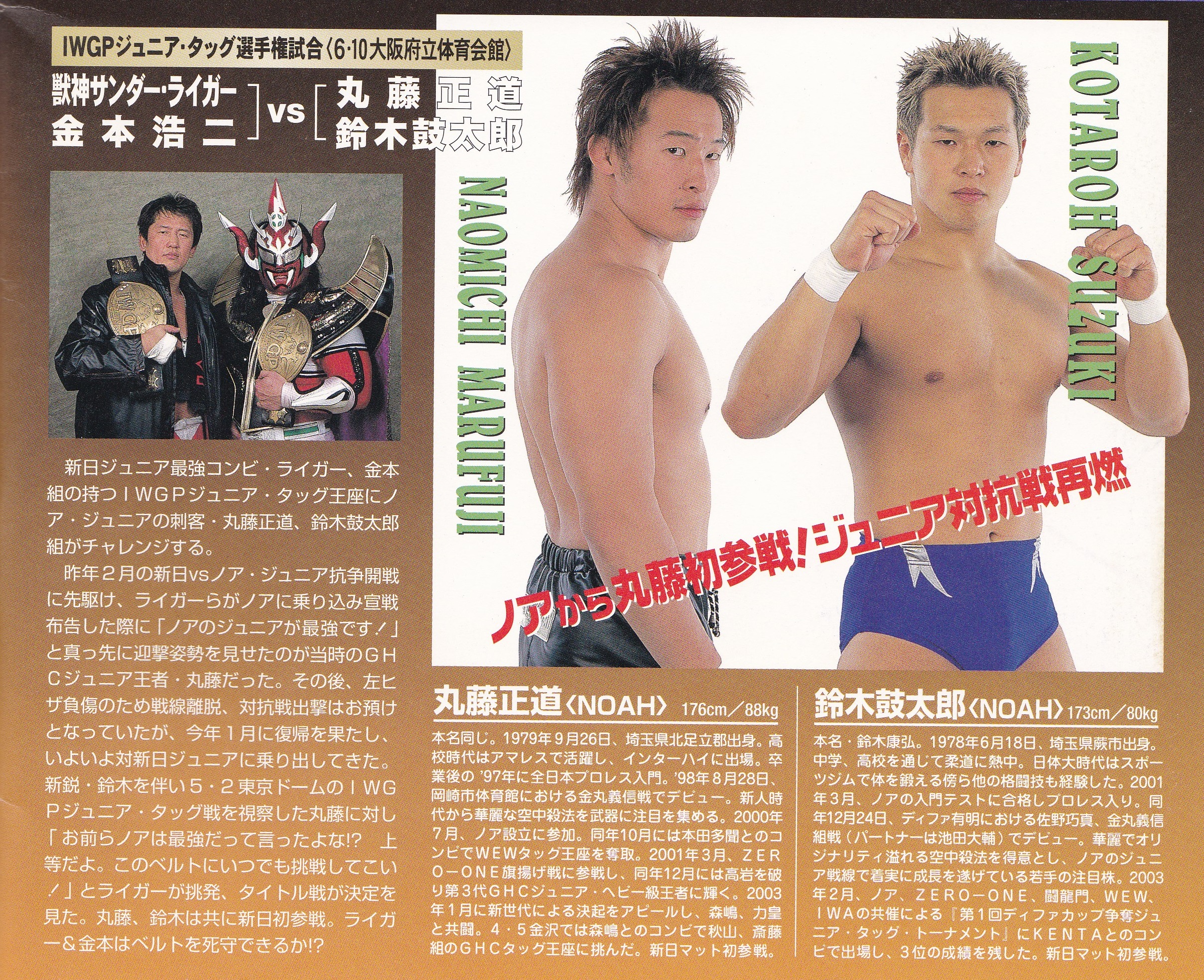 諸橋晴也他団体からの参戦はZERO1の日高のみ、NOAH所属中心の編成となったが、WRESTLE-1勢は参戦して欲しかった。だがジュニアリーグはジュニアタッグリーグと比べ定期的に開催されていないことから、今回成功すれば恒例化して拡大する可能性も秘めている。本命はGHCジュニア王座挑戦に名乗りを挙げている日高だが、自分的にはタイトルに恵まれていないタダスケや熊野に期待したい。