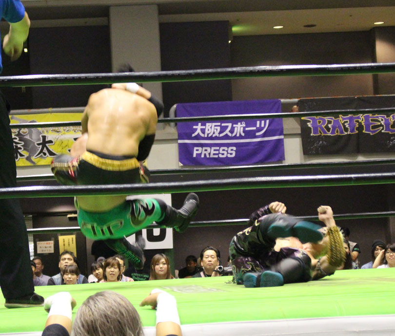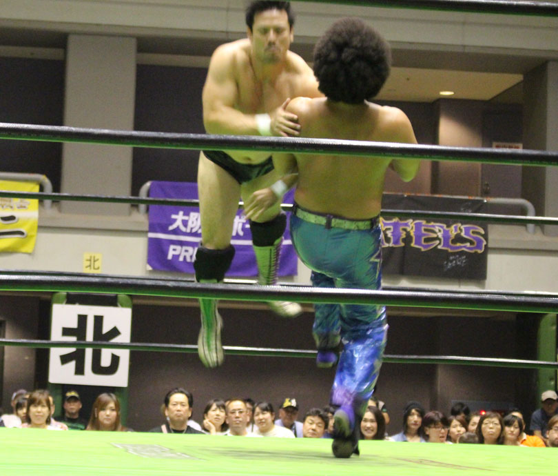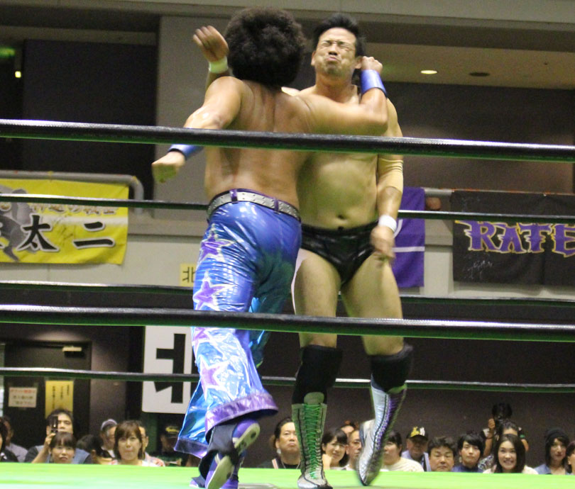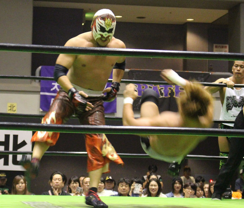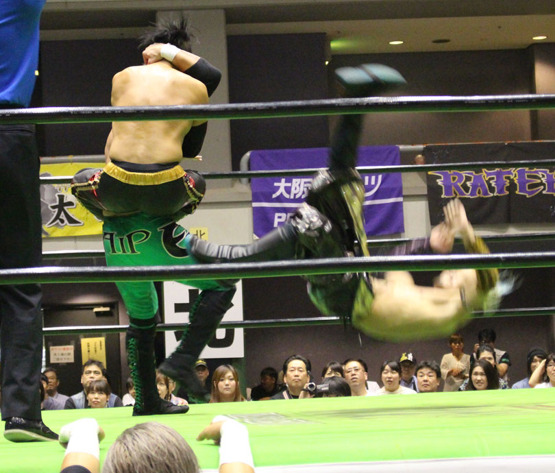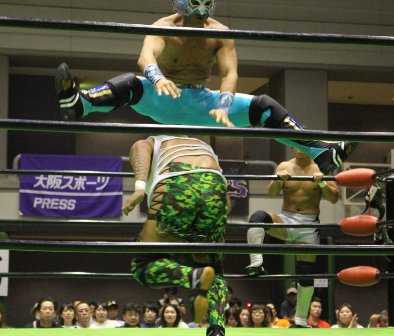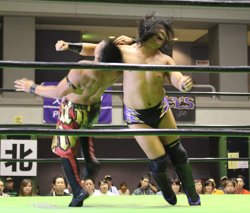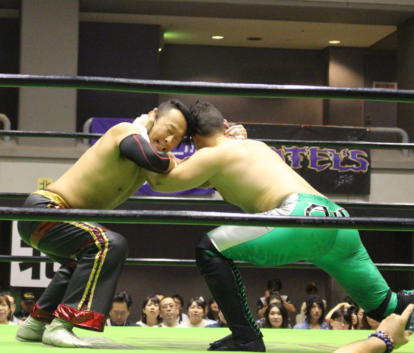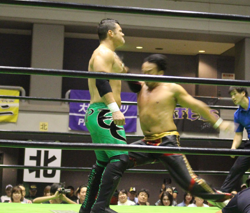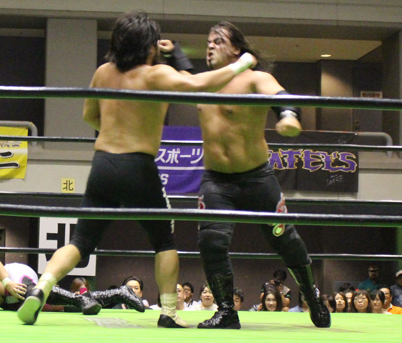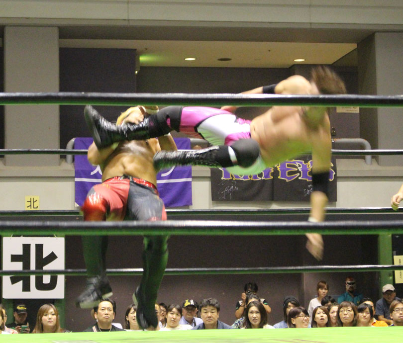 試合後には秋山&大森のワイルドバーニングが挑戦表明した、秋山&大森は10月に横浜文体でデビュー25周年大会を控えているが、挑戦するのは横浜文体大会か?世界ジュニアヘビー級選手権はTAJIRIがネックツイストから首攻めを展開し、執拗に丸め込みやカバーを何度もするなどしてウルティモのスタミナを奪いにかかり、TAJIRIにハンドスプリングエルボーをドロップキックで迎撃したウルティモも場外のTAJIRIにラ・ケブラータを狙うが、阻止され、執拗にスタミナを奪いにかかる。