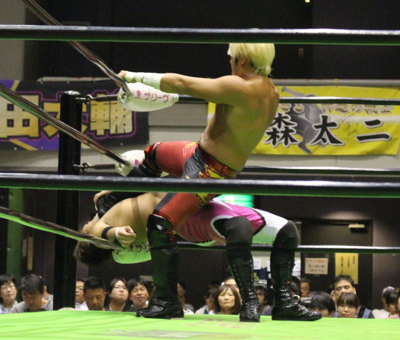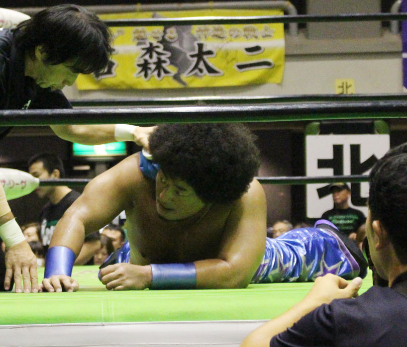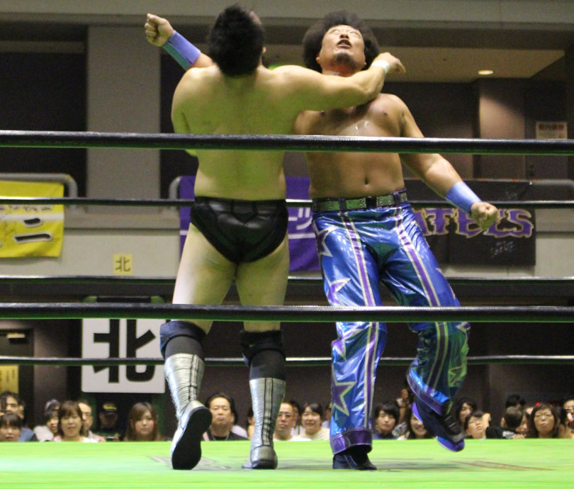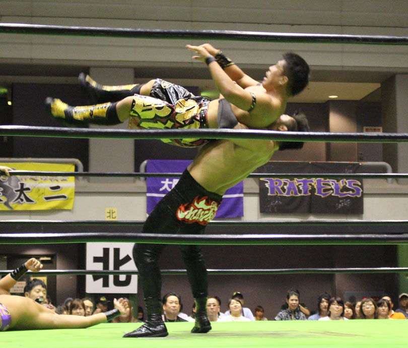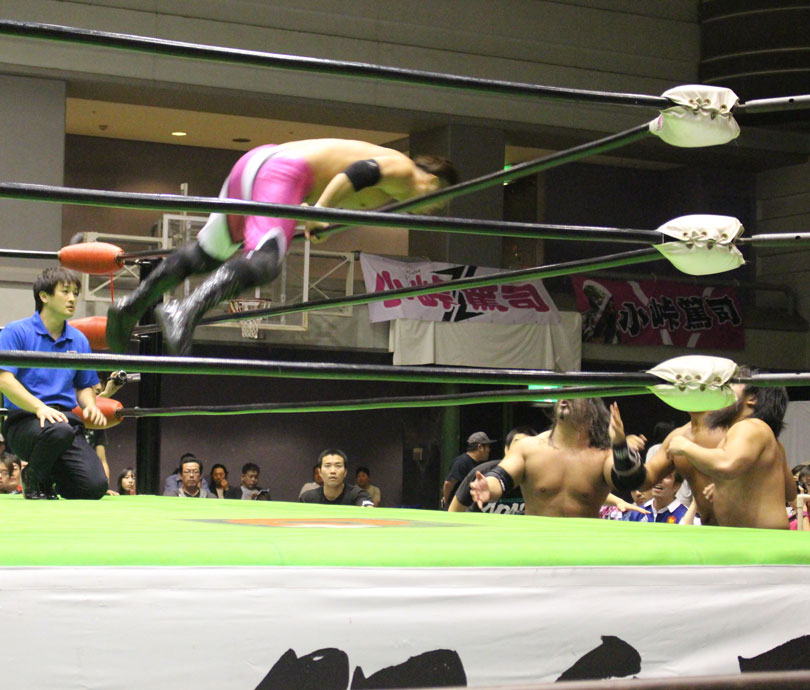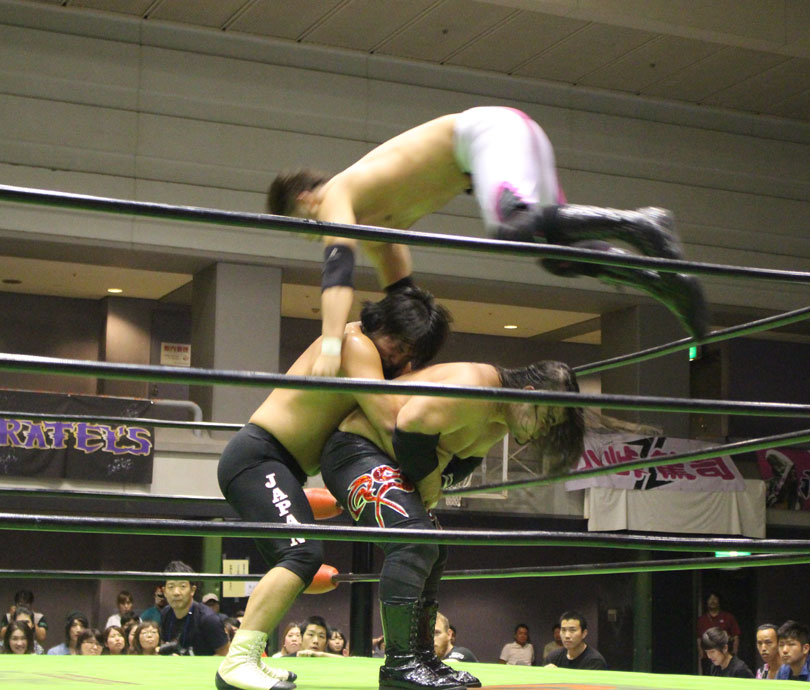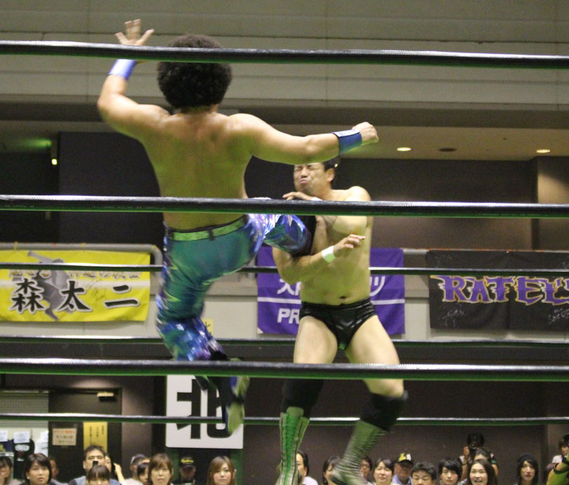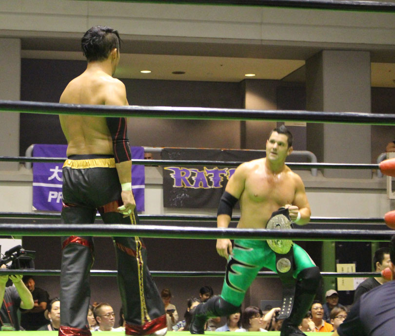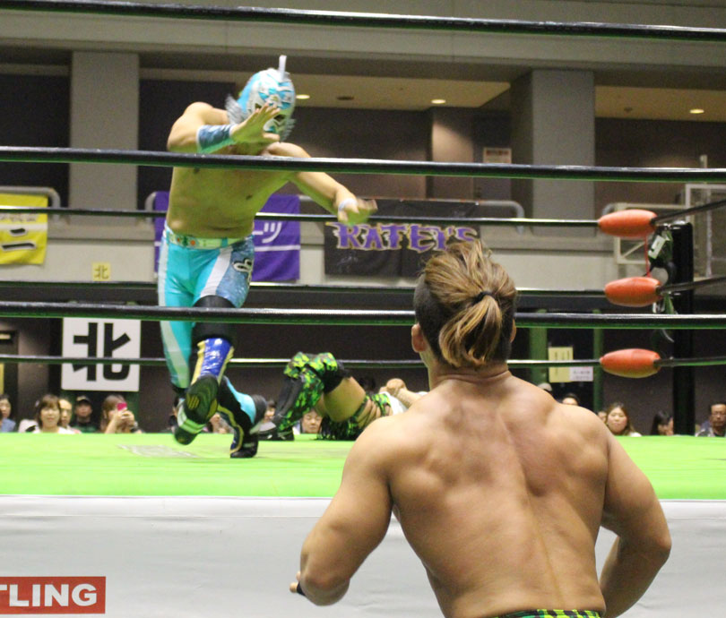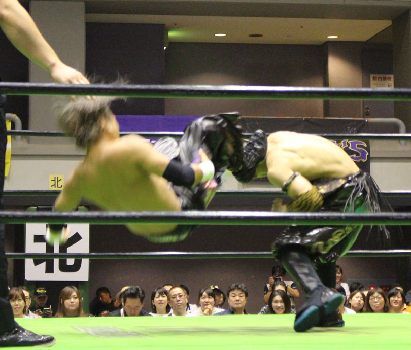 試合後には秋山&大森のワイルドバーニングが挑戦表明した、秋山&大森は10月に横浜文体でデビュー25周年大会を控えているが、挑戦するのは横浜文体大会か?世界ジュニアヘビー級選手権はTAJIRIがネックツイストから首攻めを展開し、執拗に丸め込みやカバーを何度もするなどしてウルティモのスタミナを奪いにかかり、TAJIRIにハンドスプリングエルボーをドロップキックで迎撃したウルティモも場外のTAJIRIにラ・ケブラータを狙うが、阻止され、執拗にスタミナを奪いにかかる。