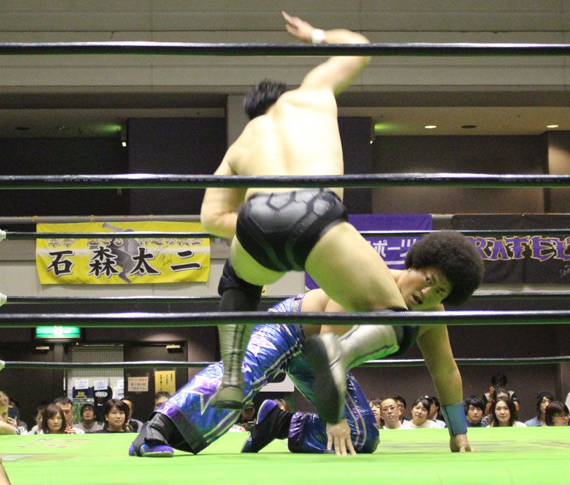 宮原の串刺しブラックアウトを狙うが、石川がキャッチしてコーナーに顔面から叩きつけるとリバースパワースラムからジャイアントニーを炸裂させ、スプラッシュマウンテンは宮原がフランケンシュタイナーで切り返してジャーマンで投げるも、石川がドラゴンスープレックスで応戦、宮原はブラックアウトから二段式ジャーマンで投げる。