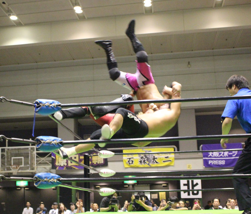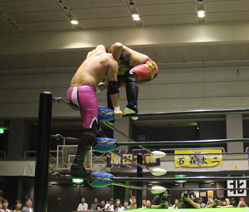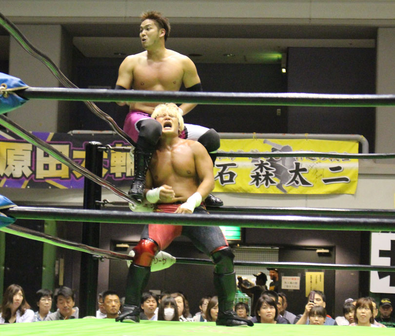 序盤は宮原がビックブーツを駆使して先手を狙うが、場外戦でエプロンダッシを狙うと、石川がかわして鉄柵に直撃させ、鉄柵を使って首攻めやギロチンホイップ、リングに戻っても、首筋へのエルボーの連打からコーナーへ河津落とし、スリーパー、首四の字と首攻めを展開して先手を奪う。