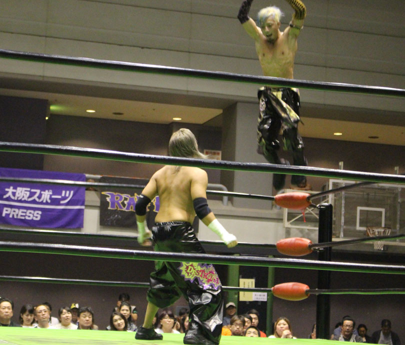 ストロングBJWはKAIにサンドウィッチラリアットを狙うが、同士討ちさせたKAIは両腕ラリアット、KAIのトラースキックの援護を得て野村がスピアーからジャーマンを決め、山折りからKAIがスプラッシュプランチャ、野村がフロッグスプラッシュと波状攻撃で岡林を追い詰めるが、関本がぶっこ抜きジャーマンでカットする。