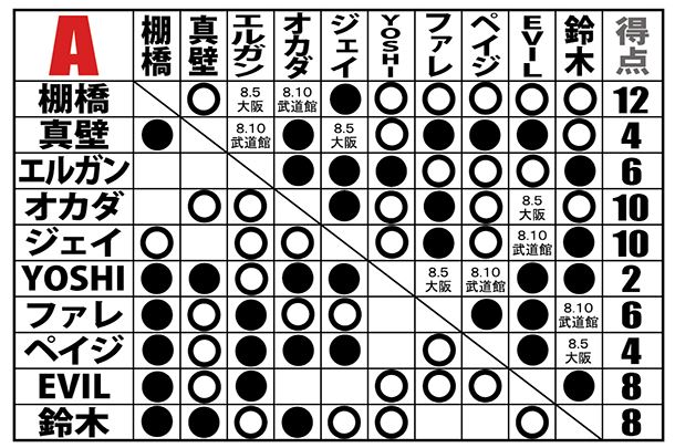 【5勝2敗=10点】○オカダ・カズチカ(18分20秒 片エビ固め)【4勝3敗=8点】×鈴木みのる