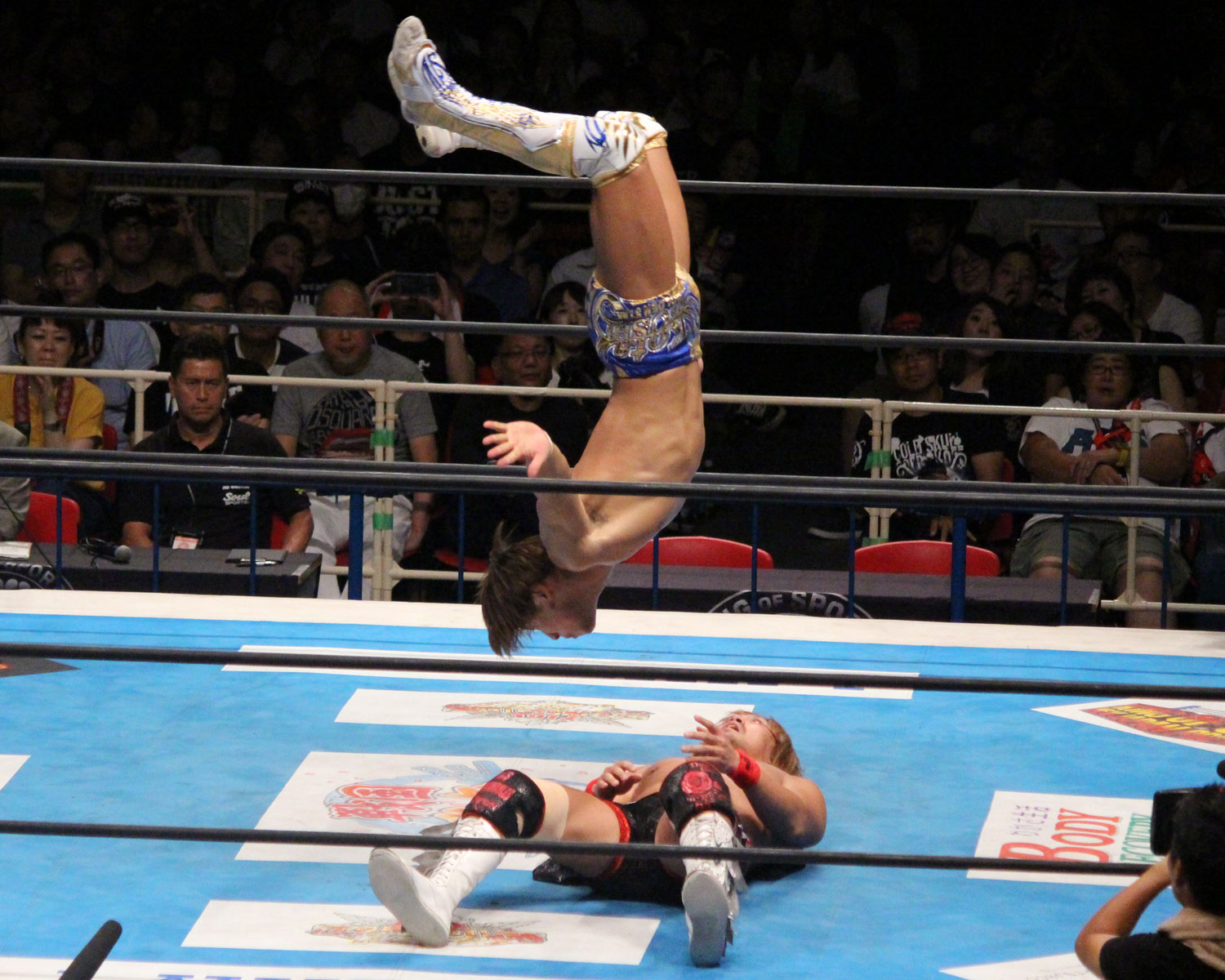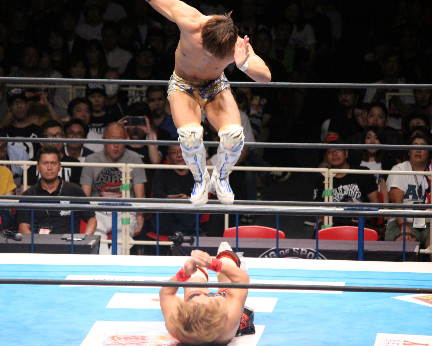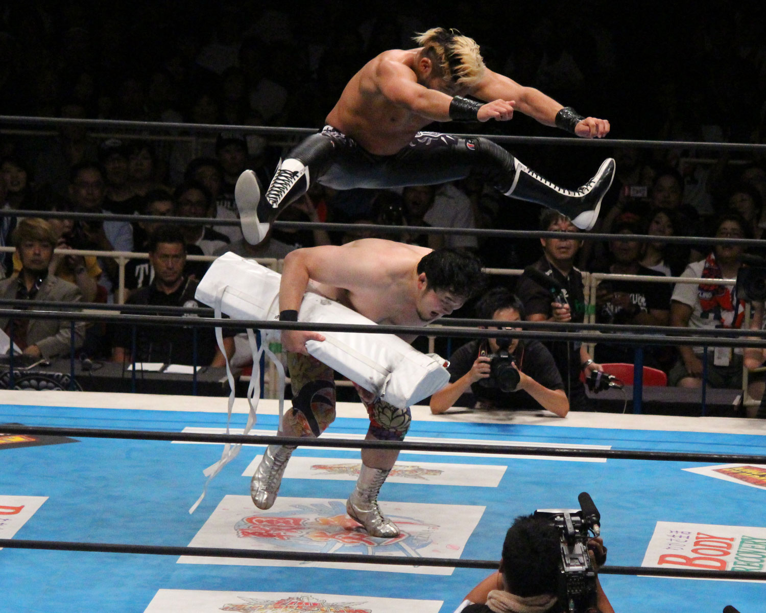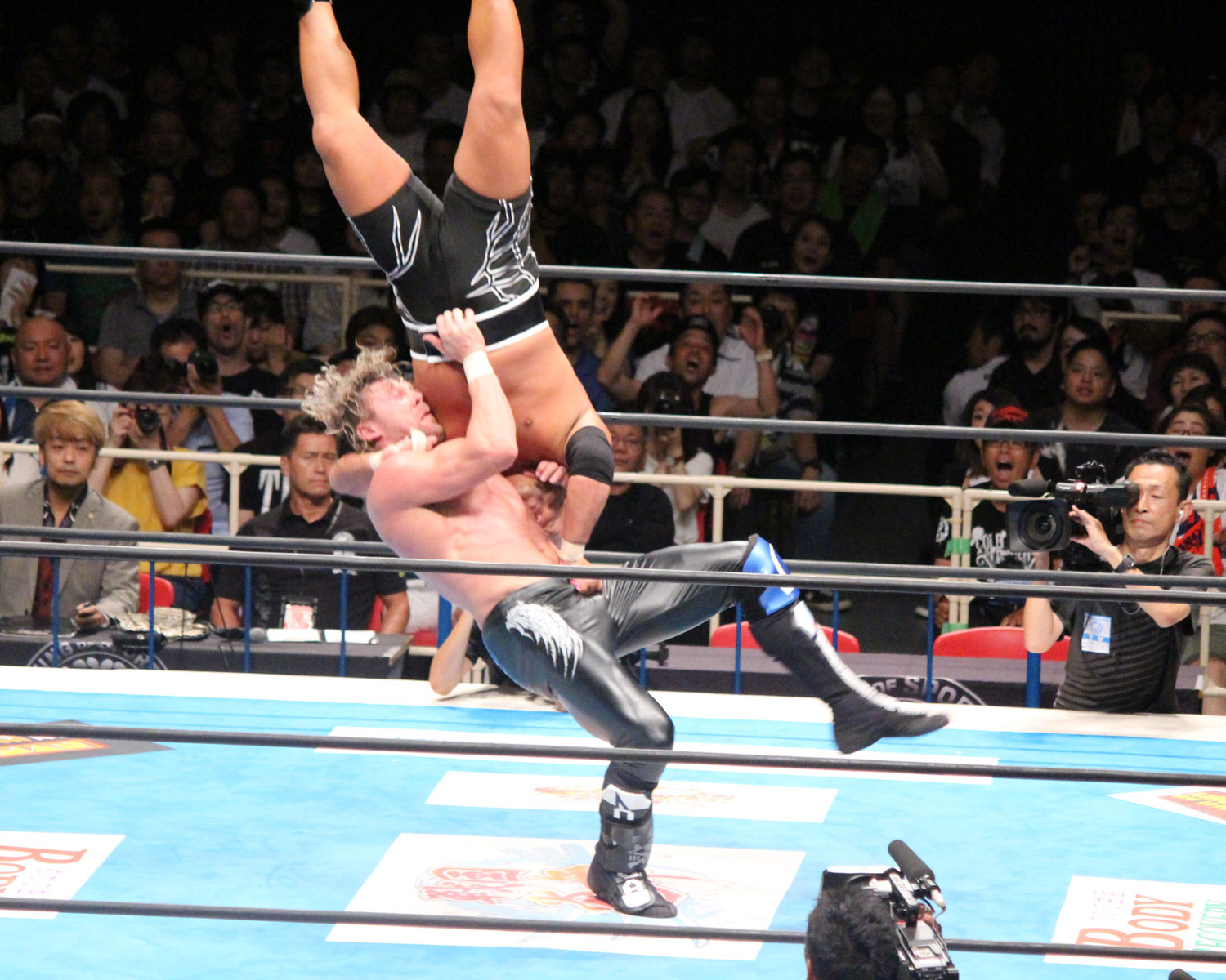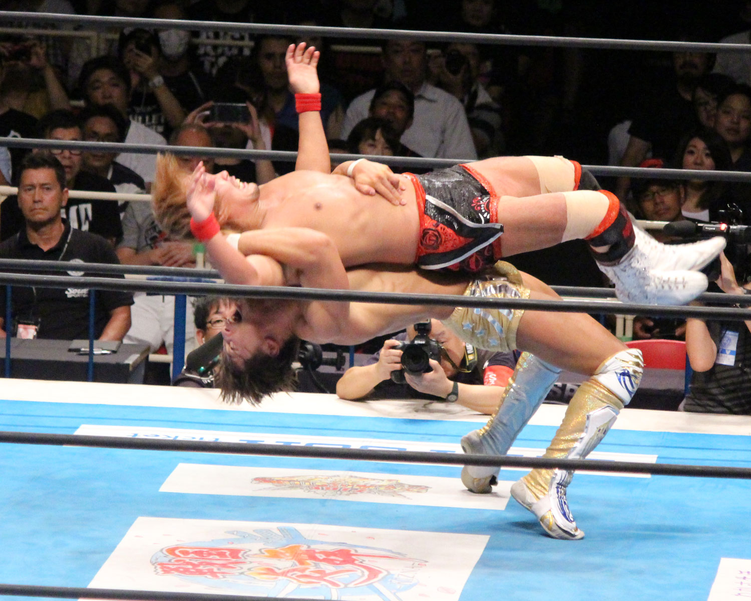 後藤は雪崩式牛殺しを狙うが、脱出した飯伏がコーナーの後藤にオーバーヘッドキックを放ち、今度は飯伏が雪崩式狙うが、後藤が回天を狙うと、着地した飯伏はカウンターのラリアットを炸裂させ、カミゴエを狙うが、後藤がエルボーで逃れるも、手を離さない飯伏はクロスアームスープレックスからカミゴエを狙う。