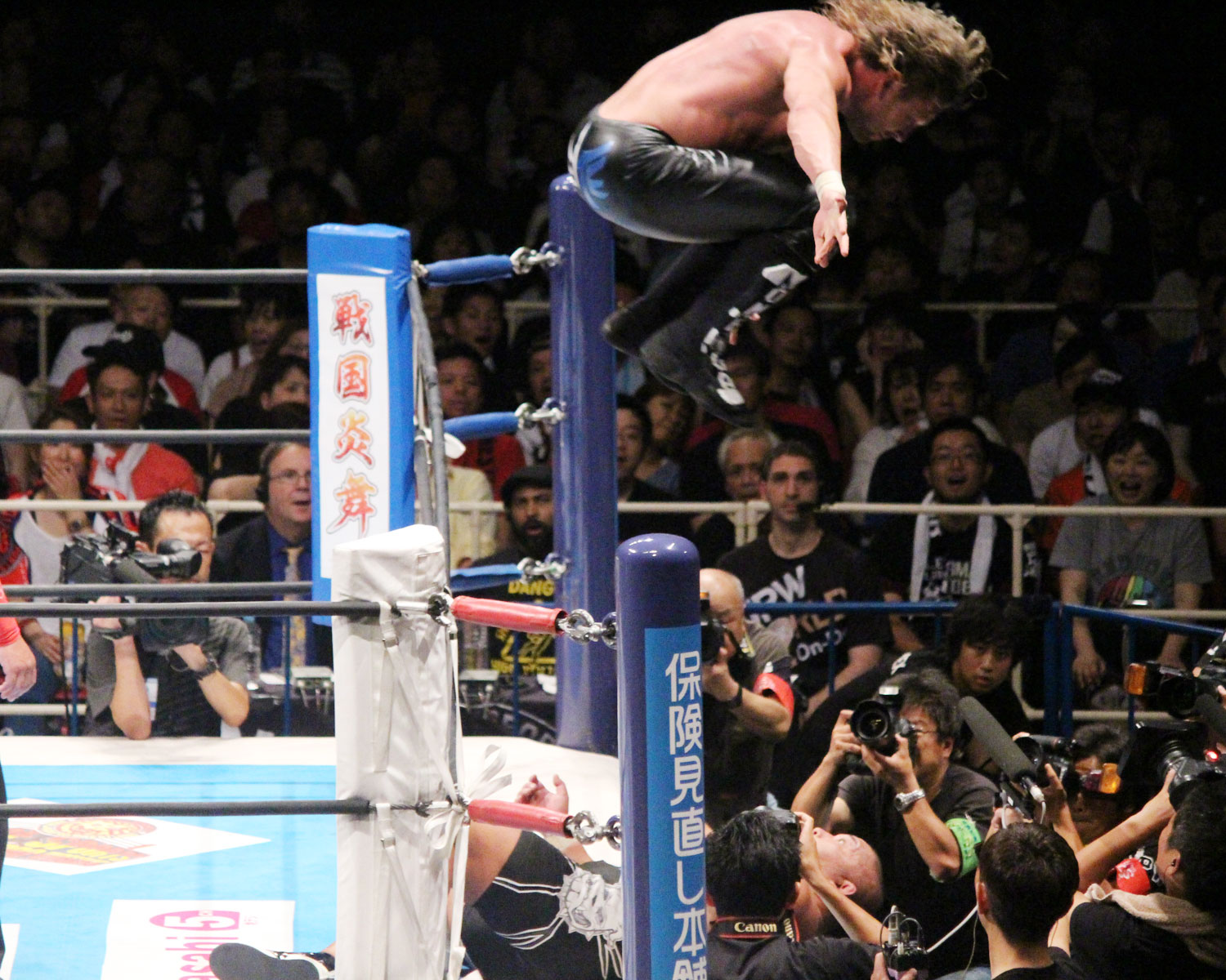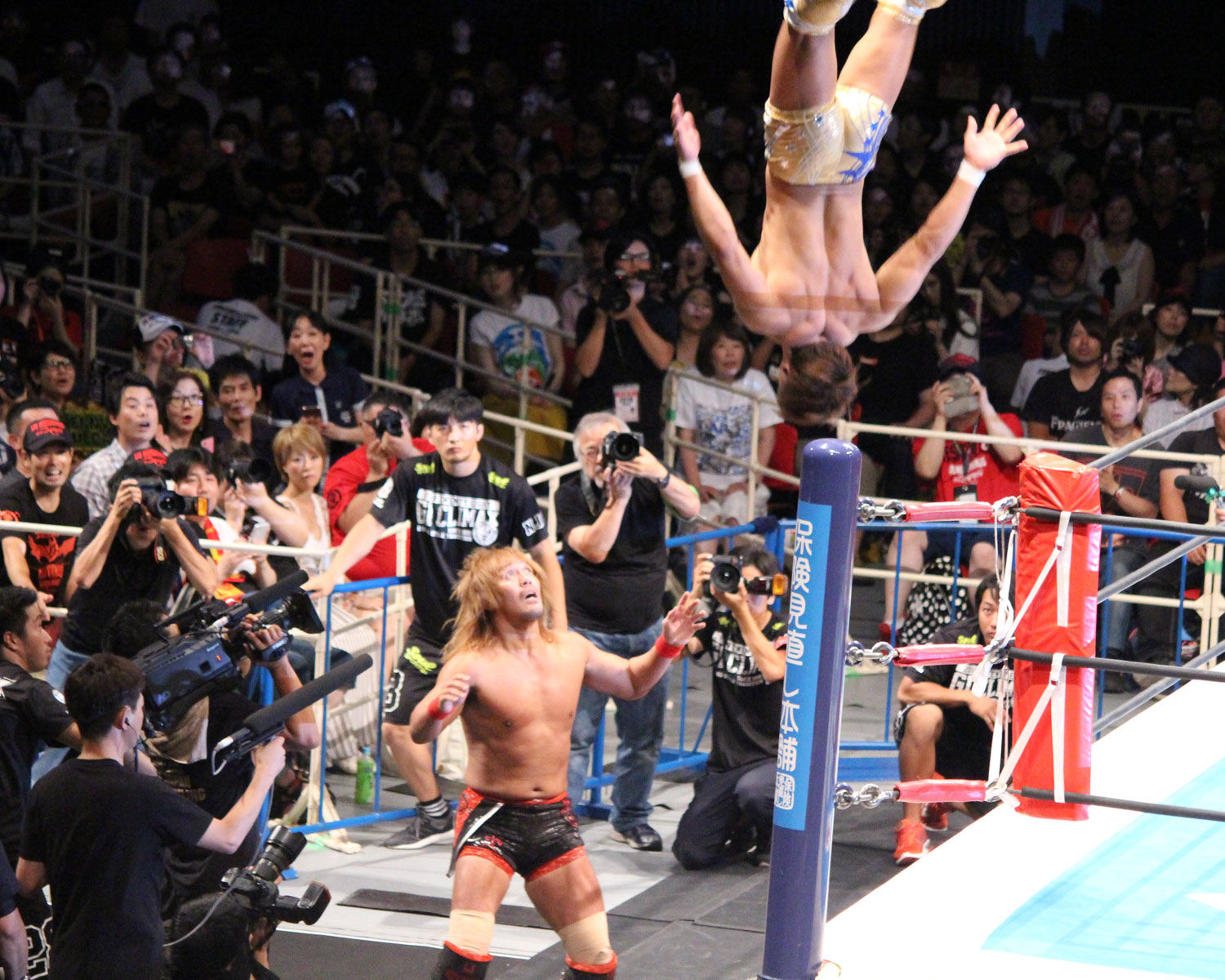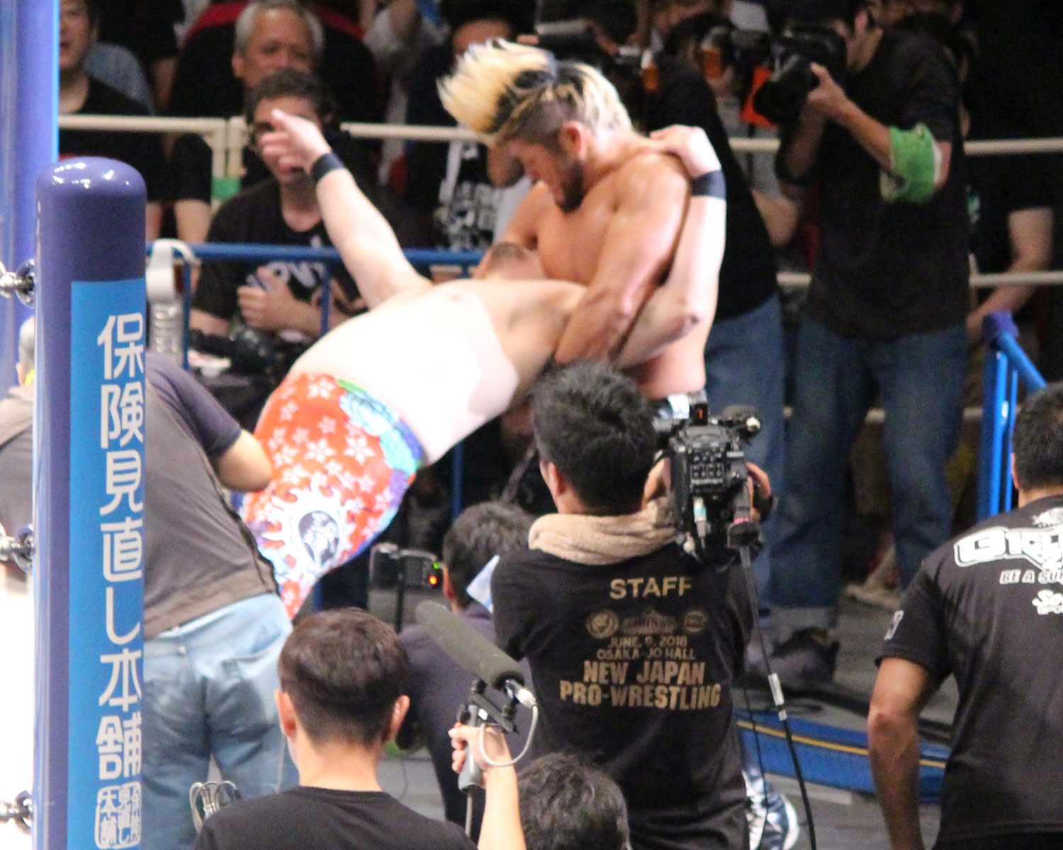 EVILはエルボーからセントーンを投下、、サーフボードで捕らえるが、棚橋がひっくり返そうとするがEVILは逃さない。棚橋はカンガルーキックで逃れて、フライングフォアアームから青天井エルボー、サマーソルトドロップと畳みかけて反撃も、棚橋はセカンドロープからのサマーソルトドロップ狙いは、EVILがラリアットを炸裂させ、棚橋はセカンドロープから場外へと転落する。