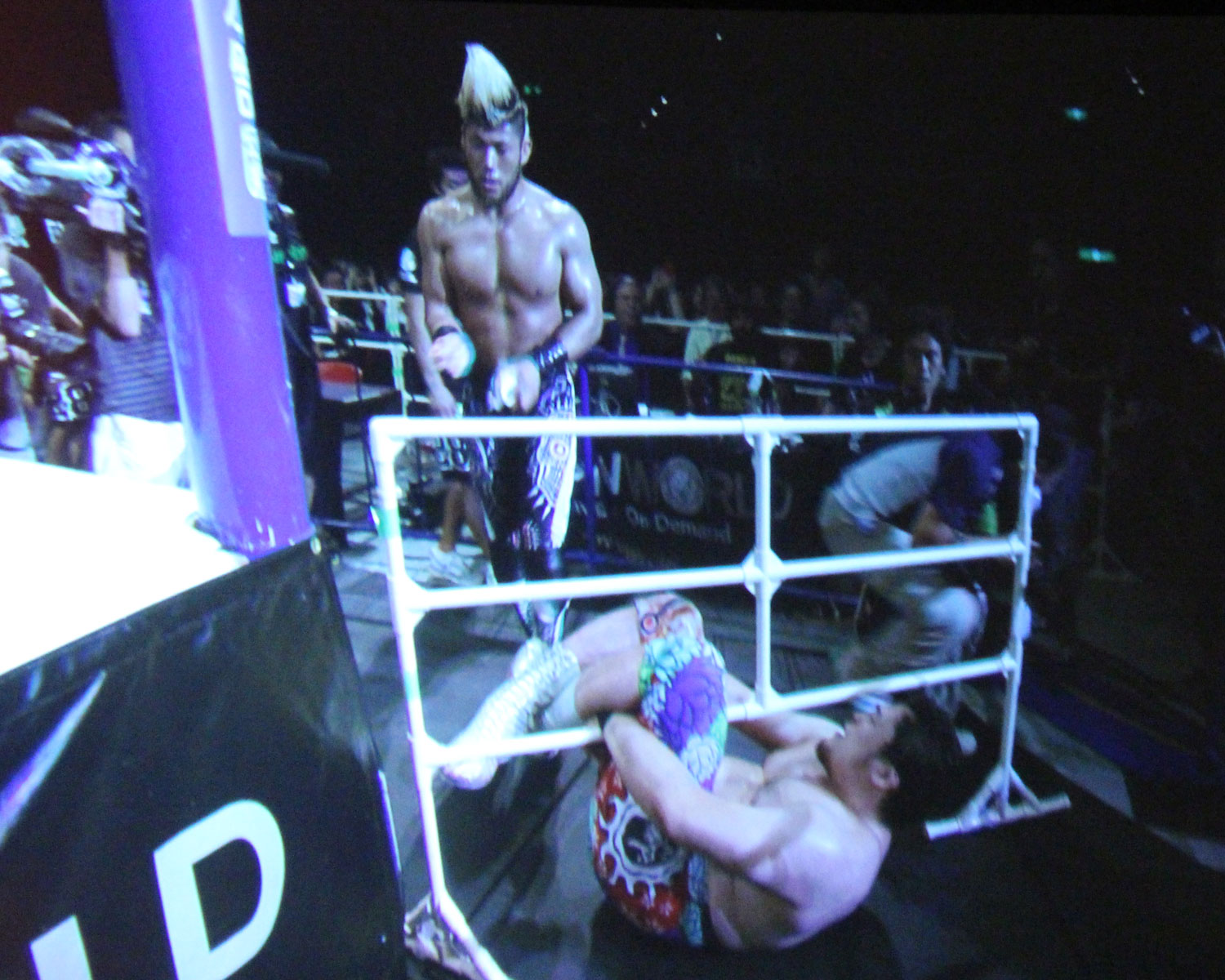 序盤はケニーからグラウンドを仕掛け、タックルから腕十字狙う、ザックも三角絞めで切り返すが、ケニーが持ち上げて、ザックは出鼻を挫く、しかしケニーのリーブロックをザックがキャッチして倒し弓矢固めを狙うと、ケニーのVトリガーをかわしたザックはボディーへ頭突きも、串刺しはケニーがビックブーツで迎撃して場外へ追いやると、ノータッチトペコンを狙うが、ザックがエプロンでアンクルホールドで捕獲、逃れたケニーはザックを鉄柵外へ出すと、鉄柵からのケブラータを発射し、花道へ連行してツームストーンパイルドライバーを狙う。