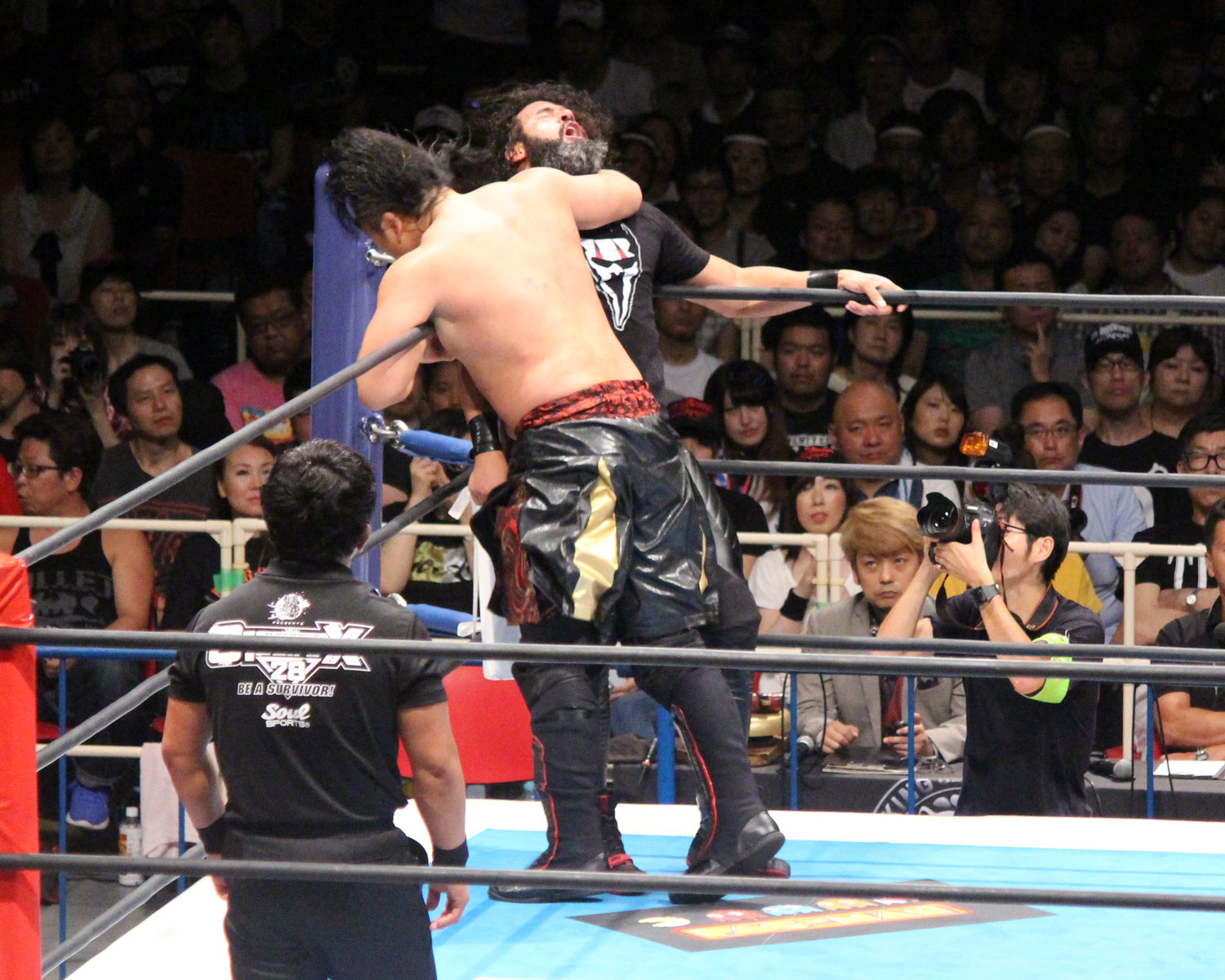 矢野が反撃して崇コーナーを作るも、コーナーポストでの殴打はレフェリーに阻止され、内藤は崇コーナーに直撃した矢野にコーナーミサイルから、コーナーポストでフルスイングする。