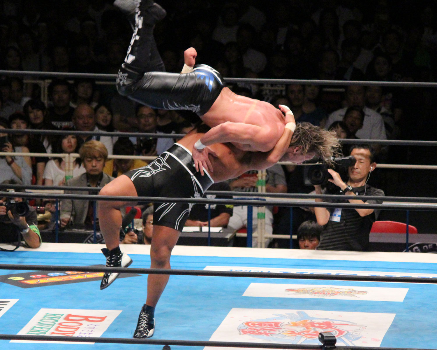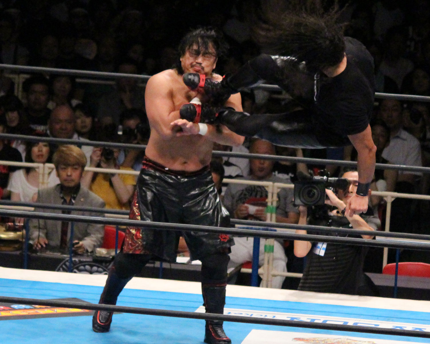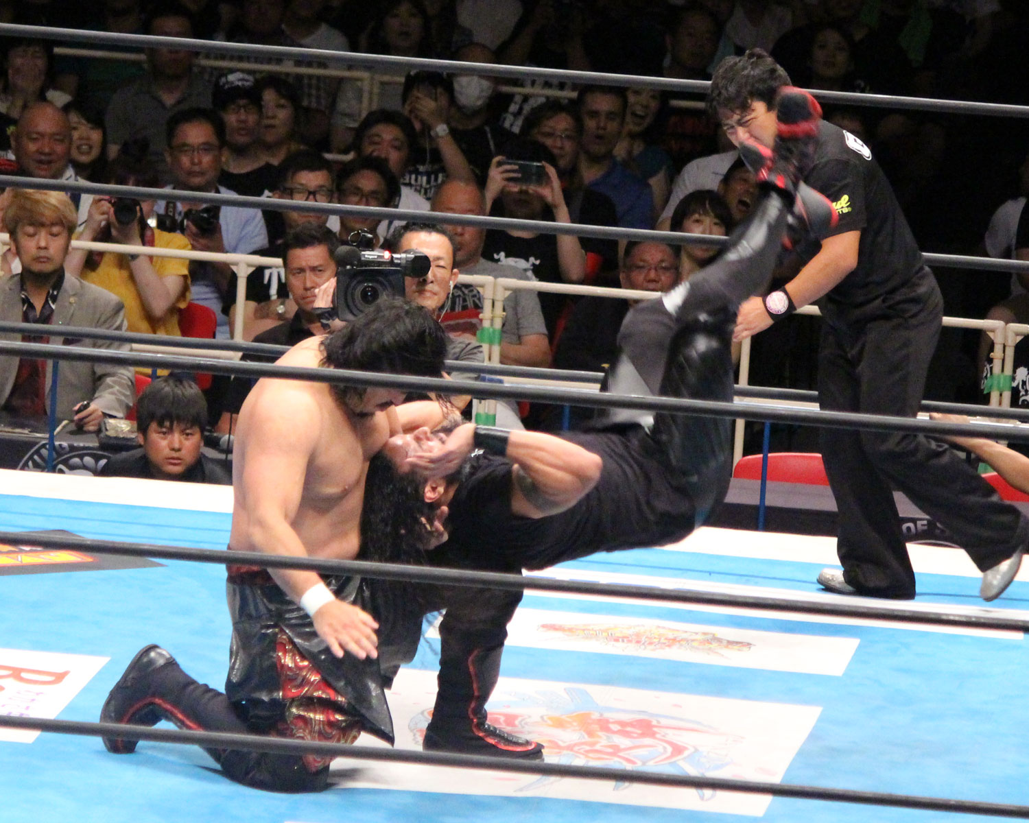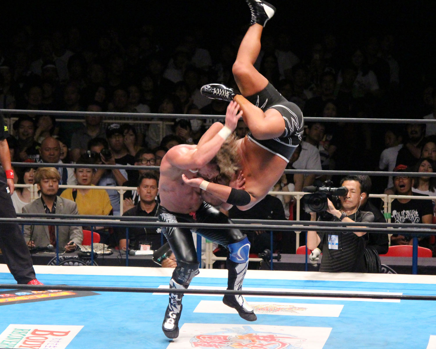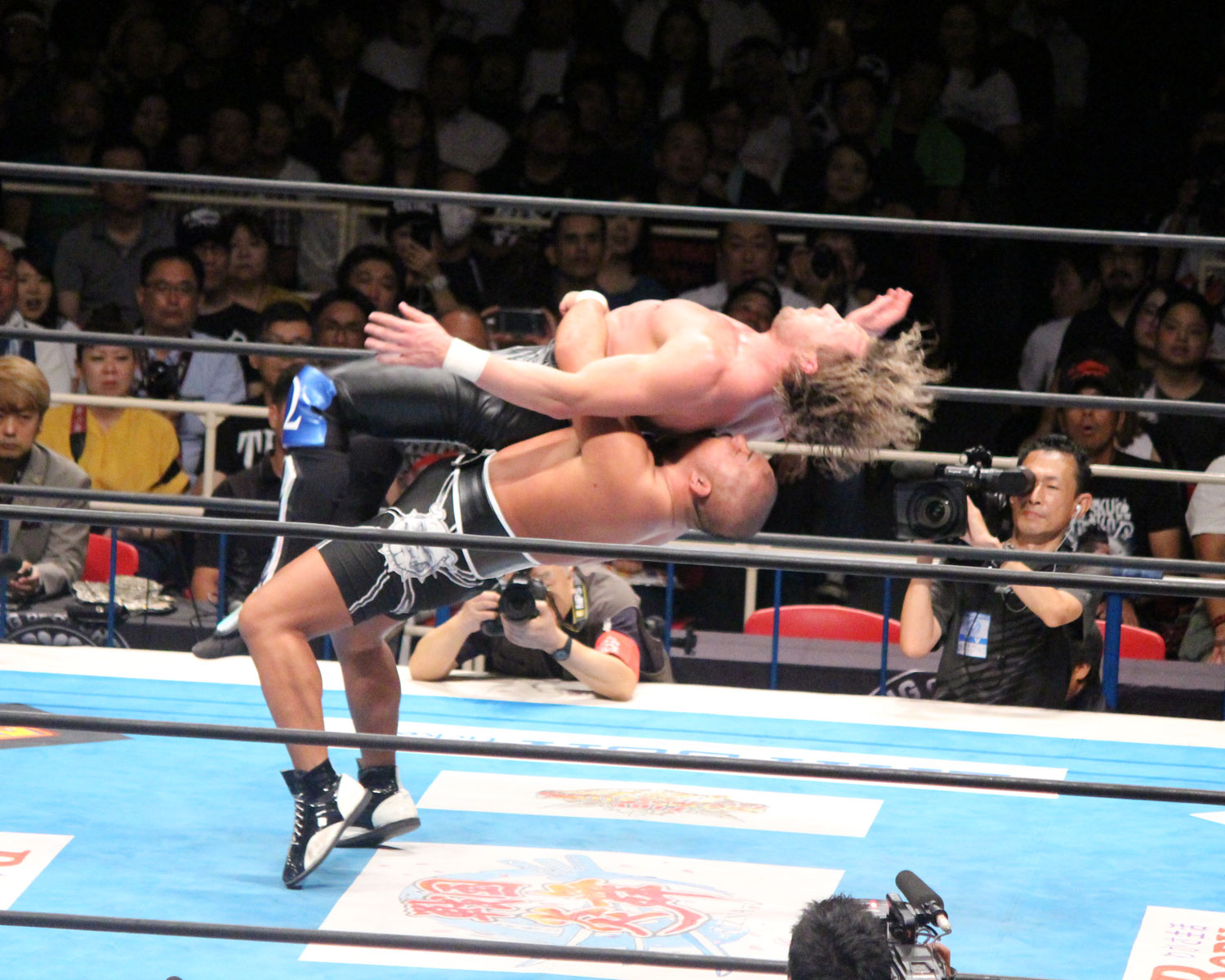 しかし後藤がかわして顔面への頭突き、カウンターのエルボーからショートレンジラリアット、裏GTRからGTRで勝負に出るが、飯伏がバク転で逃れて槍投げ狙いは、後藤がスリーパーで捕獲して絞めあげる。