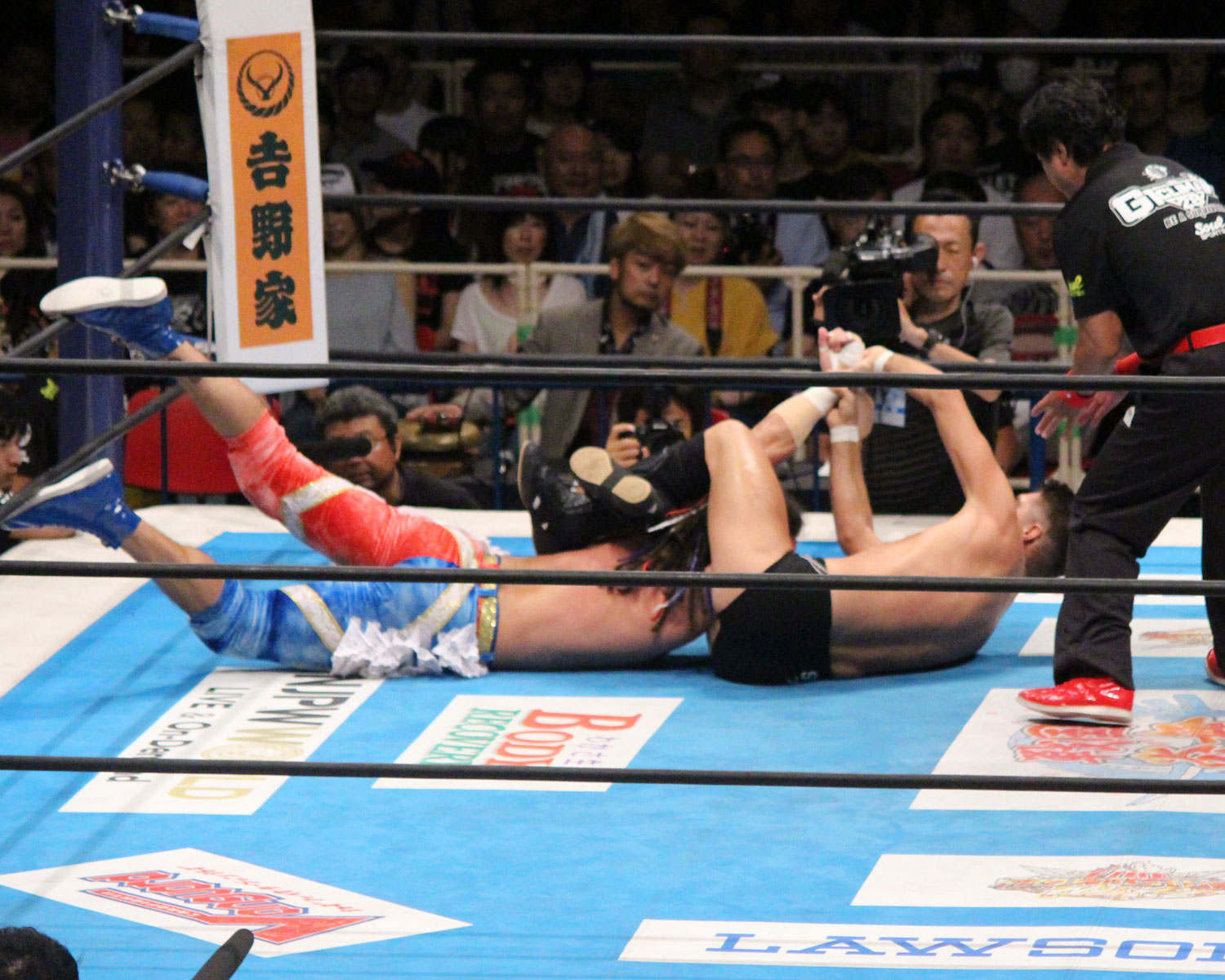 後藤は頭突きを狙うが、ビンタで阻止した飯伏がハイキックを一閃、そしてG1で使用し始めたボマイェを炸裂させると、シットダウン式ラストライドからカミゴェで3カウントを奪い2敗を堅守。後藤も飯伏のパターンを読みきってはいたが、飯伏もGTRだけはしっかりマークして一気に抜き去った。内藤vs矢野は、矢野のロックアップ狙いを内藤がいなして焦らすすと、背後から矢野が襲撃、、矢野はブレーク連呼しようとするが、内藤がスライディングで場外に降りて足をすくい、リングに戻って寝そべりフェイントも、矢野はデニーロポーズで応戦する。