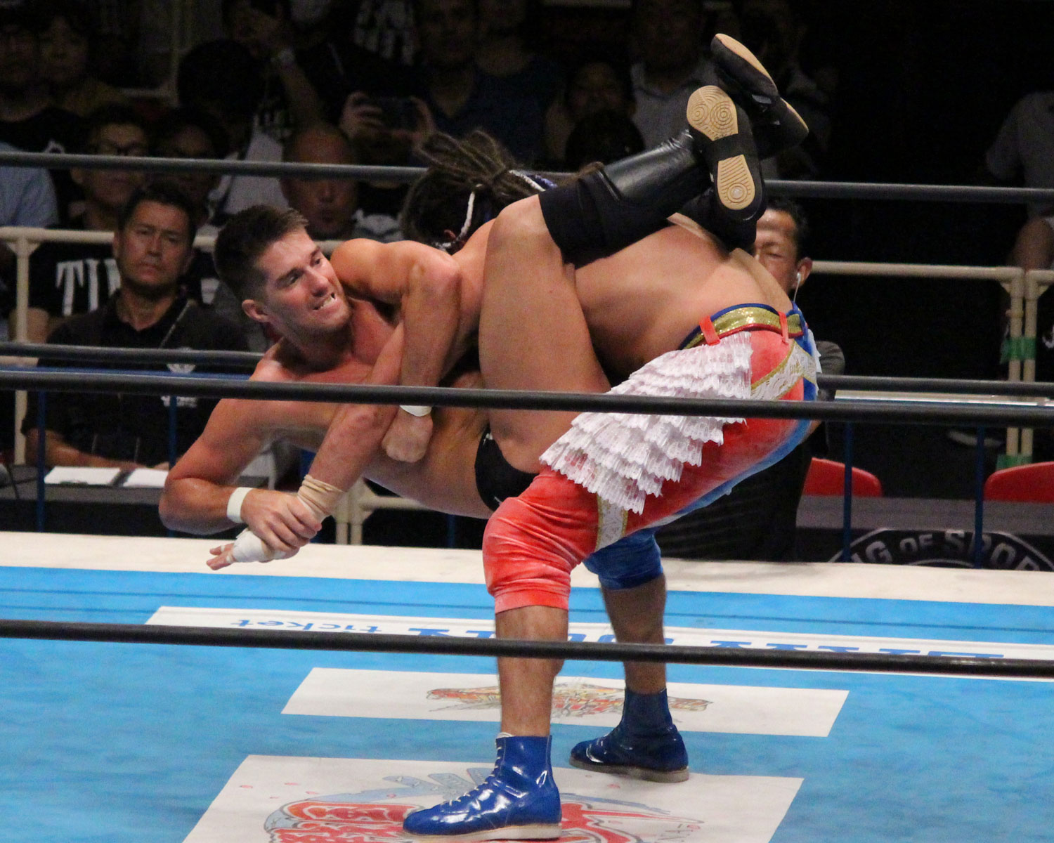 ジュースはパワーボムを狙うも、SANADAが逃れると、ジュースはビックブーツから突進をSANADAが連続リーブロックからドロップキックで場外へ追いやり、SANADAがプランチャを命中させ、、リングに戻ってもSANADAがドロップキックも、ジュースはスピンキックからプリンスズスロウン狙いはSANADAがSkull Endで捕獲、ところが、ジュースが裏返って掟破りのSkull Endで絞めあげると、掟破りのラウディングボディープレスを投下するが自爆となってしまう。