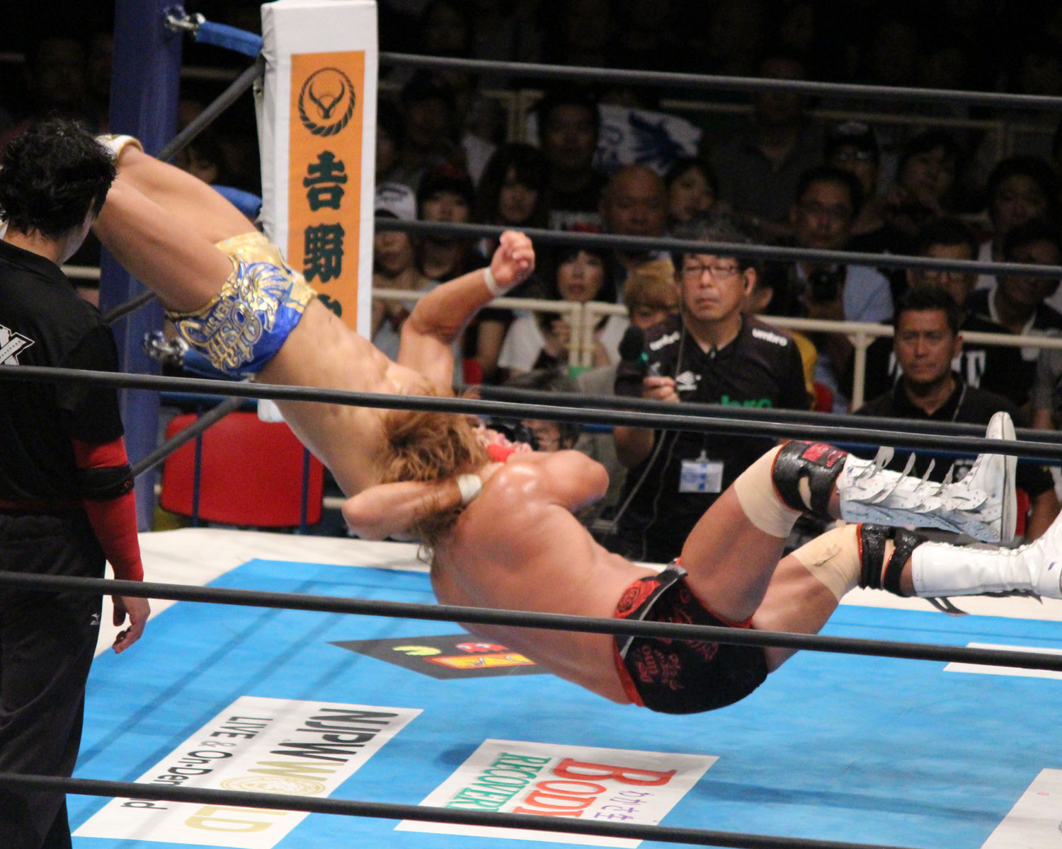 序盤こそはケニーが自身のペースへと引き込もうとするが、右膝攻めで一気に流れを変えてからケニーに様々な罠を仕掛けたが、ザックもおそらく片翼の天使にヤマを張って罠を仕掛けたと思う、だが思わぬ丸め込みでヤマが外れてしまった。ザックにしても悔しい敗戦だったと思う。メインの後藤vs内藤は、後藤がヘッドロックで執拗に絞めあげて首攻め、串刺し狙いは飯伏がかわしてフランケンシュタイナーで後藤を場外へ追いやり、バミューダトライアングルを狙うが、後藤がリングに戻るとエプロンに不時着した飯伏に後藤がロープ越しのラリアット、場外戦の後で、リングに戻って後藤はチンロックからクルックヘッドシザース、フェースロック、頭部にエルボードロップと執拗に飯伏の首を攻める。