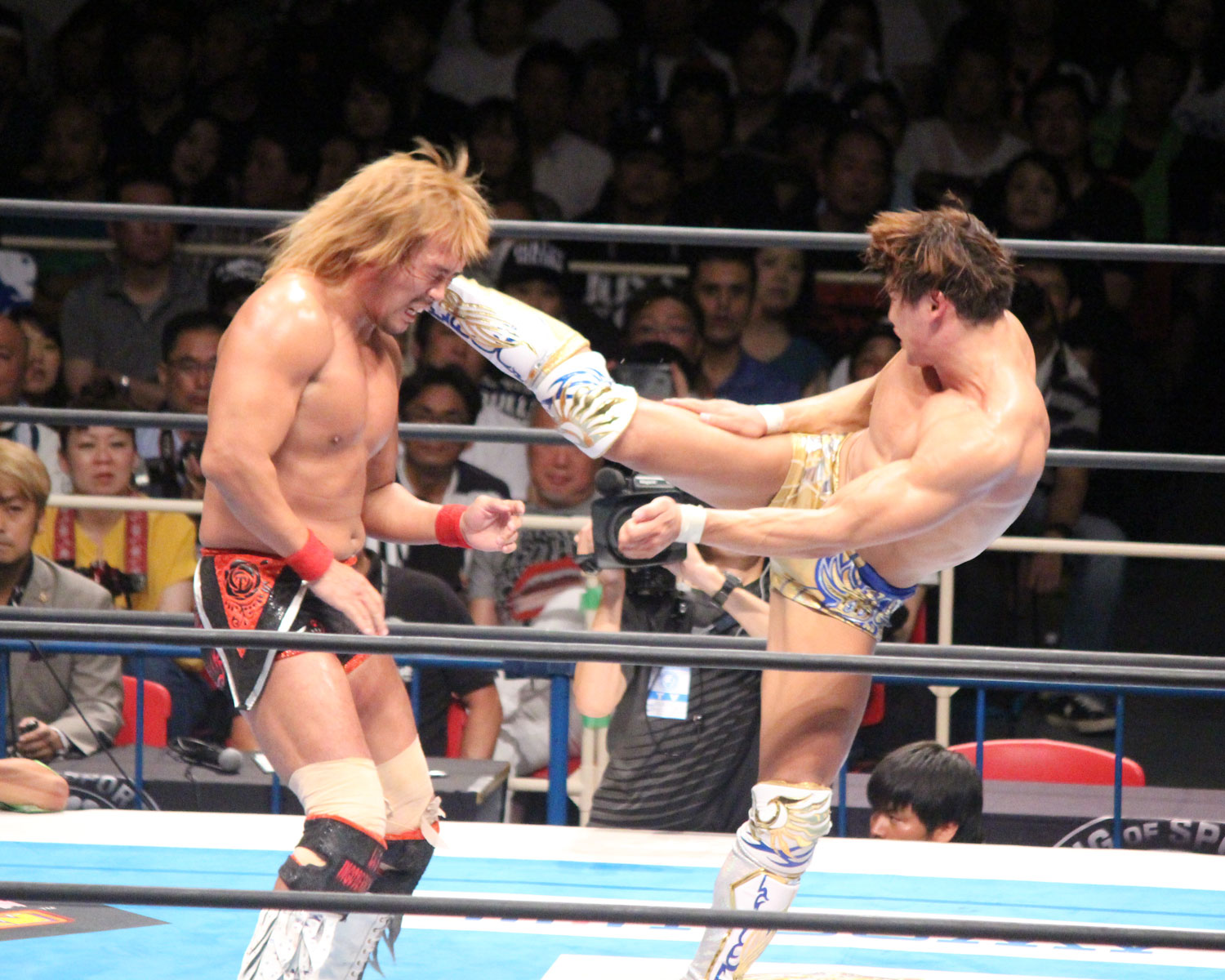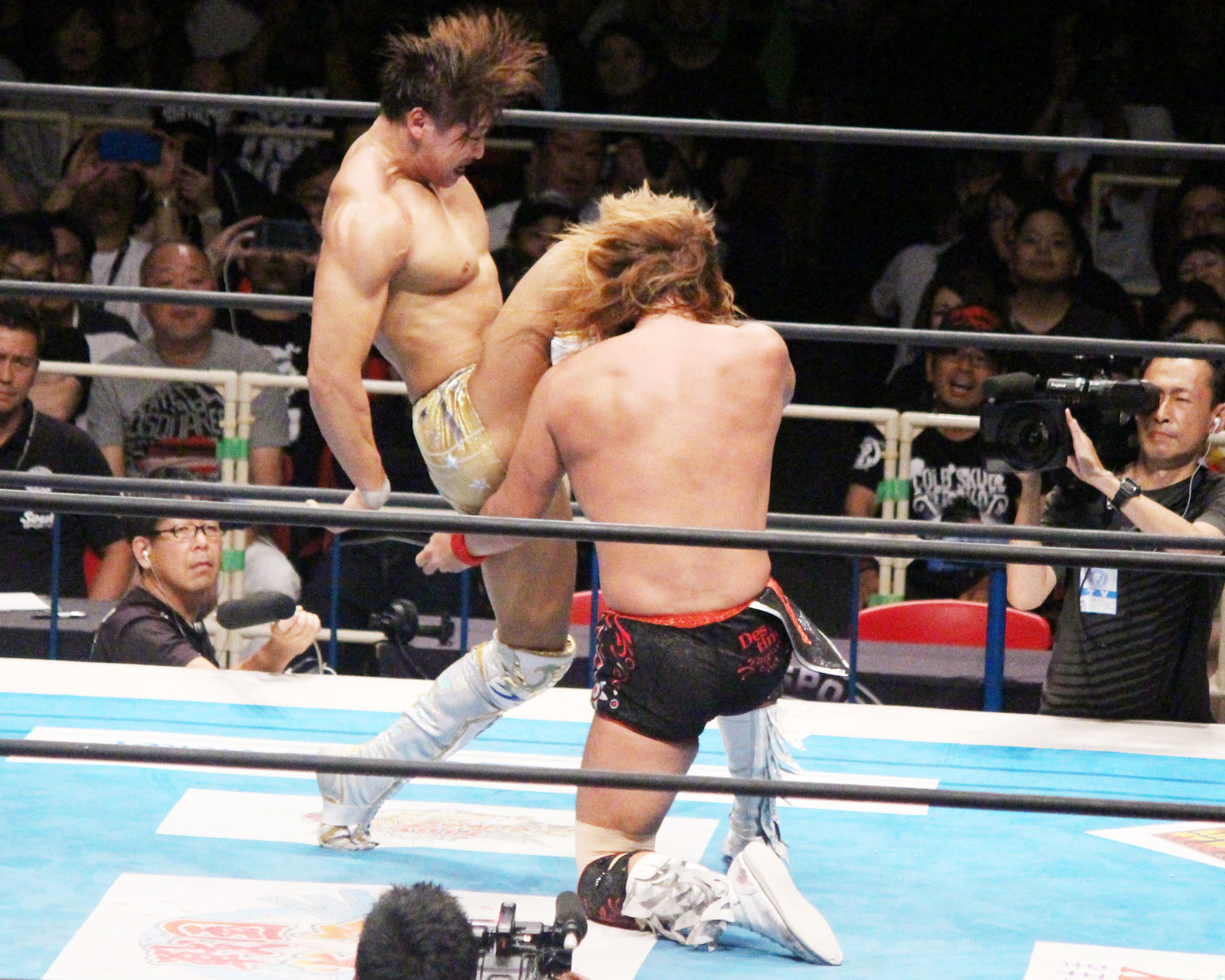 両者はエルボー合戦となり、互いに譲らずも、鈴木がビンタを浴びせると、ゴッチ式パイルドラバー狙いはオカダがエビ固めで切り返し、鈴木の突進をドロップキックで迎撃するが、鈴木はビンタのラッシュで返し、オカダはエルボースマッシュの連打から突進は鈴木がドロップキックで迎撃する。
