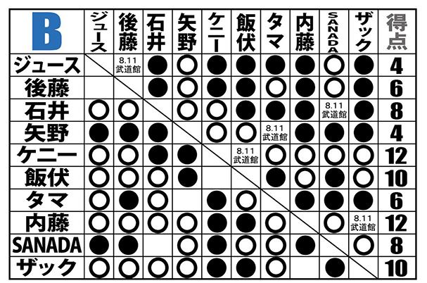 これでBブロックは4~5敗の後藤、石井、タマ、ジュース、矢野の脱落が決定、全勝のケニーに1敗の内藤、2敗の飯伏が追いかける展開となった。荒夏!!!!!