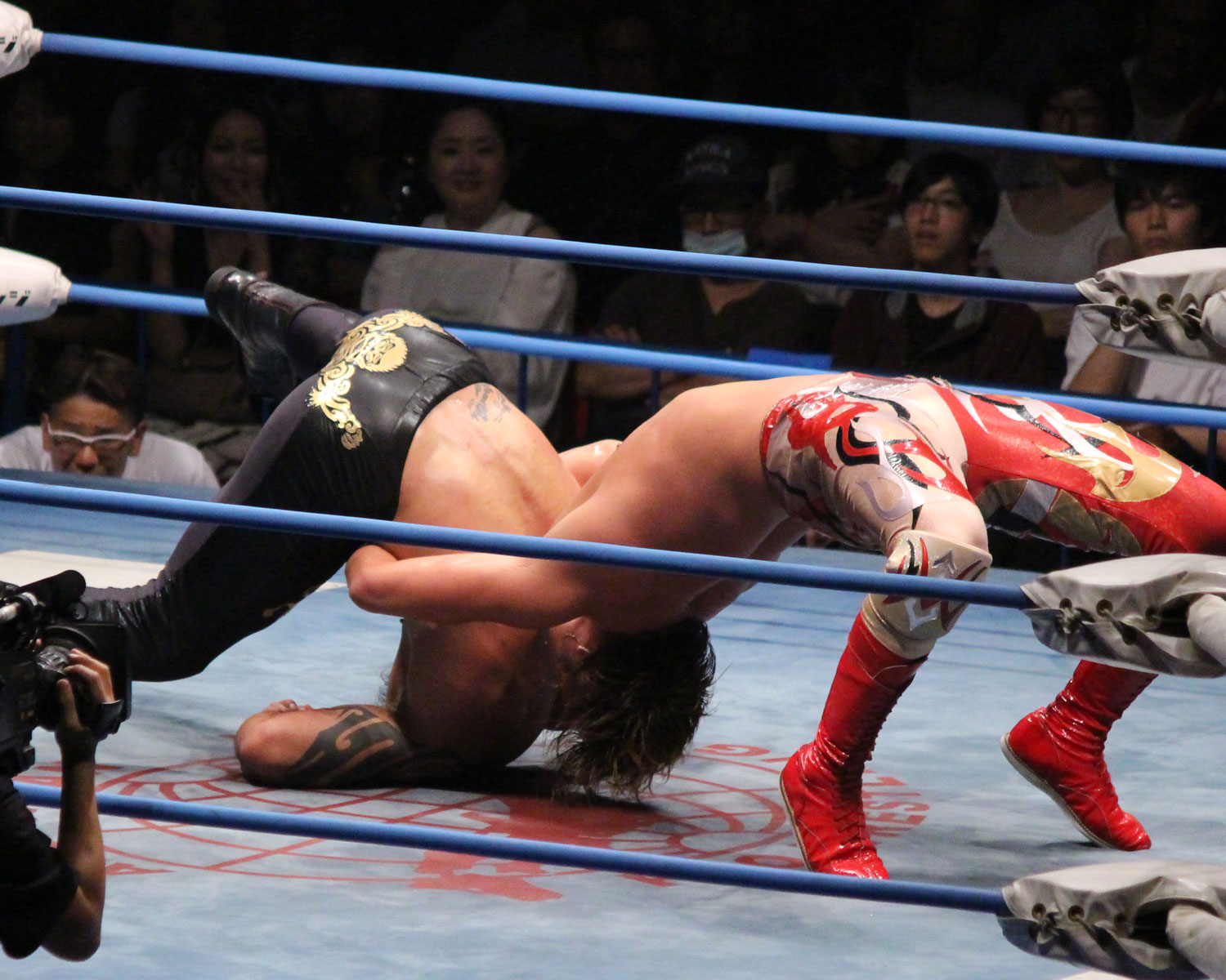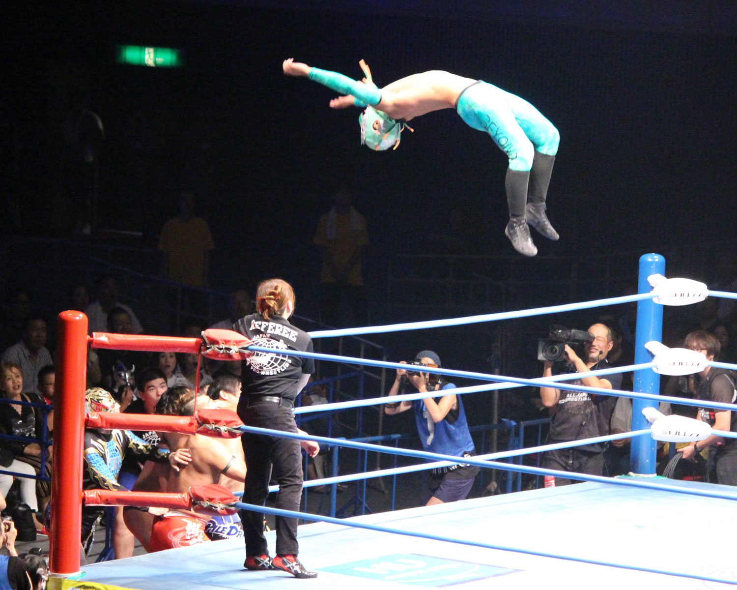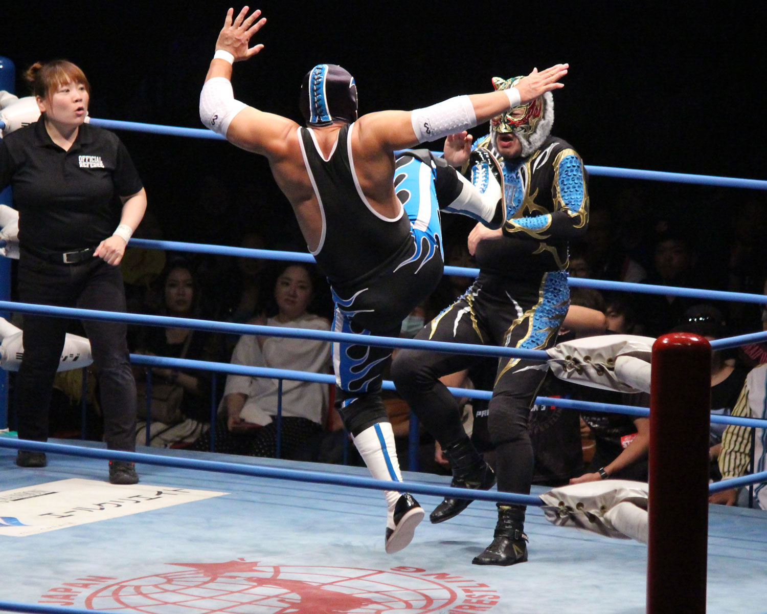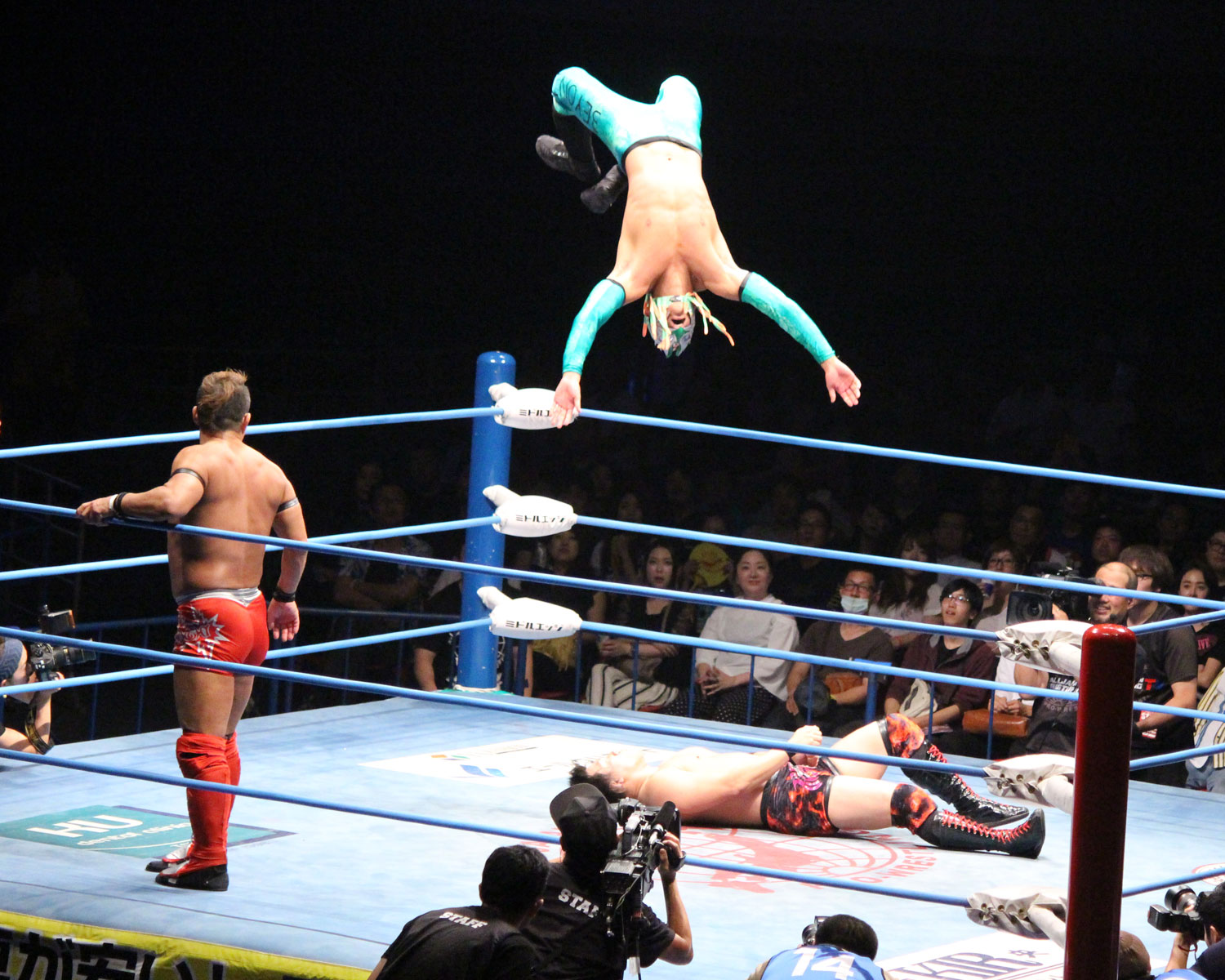 竹下のジャーマン狙いはチサコがビックブーツでカット、里村がスコーピオンライジングの援護からカサンドラがミサイルキック、エルボーの連打も、竹下がエルボーで応戦、カサンドラは竹下と彰人を同士討ちさせ丸め込みの連発し、コーナーからのアストロシザースから場外の竹下にトペ、リングに戻って彰人へのスワントーンボムは投下も自爆してしまう。