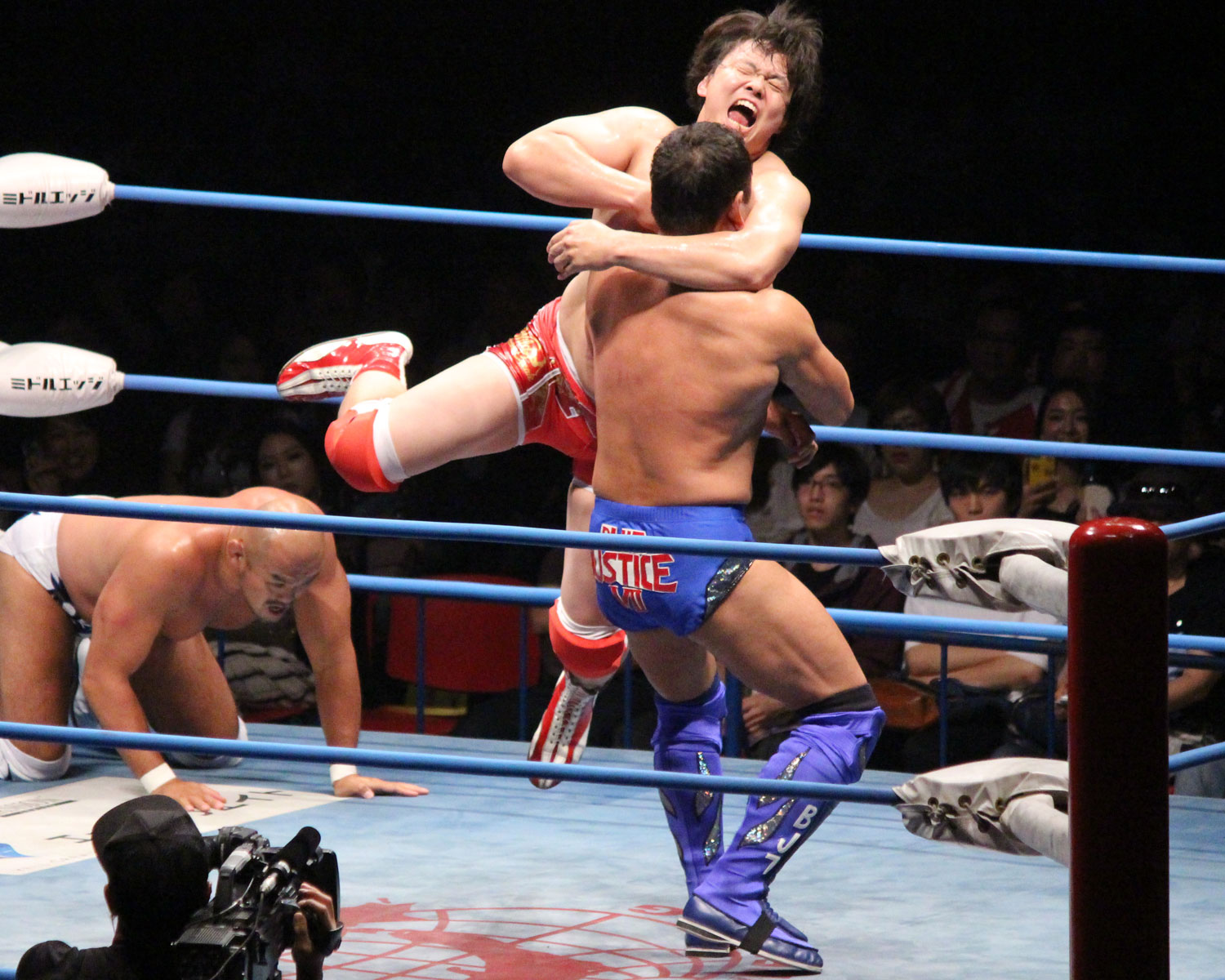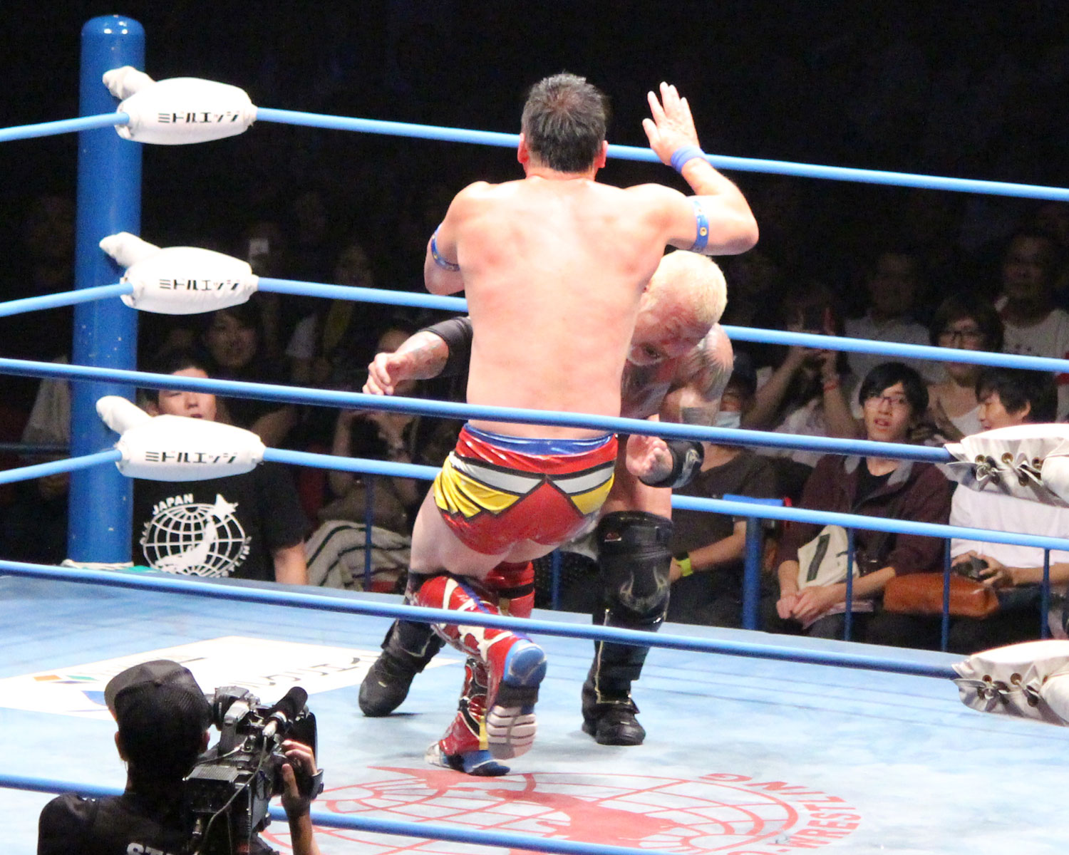 — DDT ProWrestling (@ddtpro) 2018年7月24日カサンドラはブレーンバスターで反撃して、コーナーのチサコを雪崩式ブレーンバスターで彰人に投げつけ、彰人はゴリー式膝砕きで返すも、チサコは里村の援護で丸め込みの連打、彰人はニーアッパーで返し、、交代した勝俣はチサコの側頭部にランニングキックからミサイルキックと攻め込む。