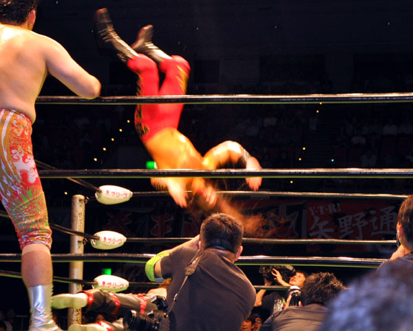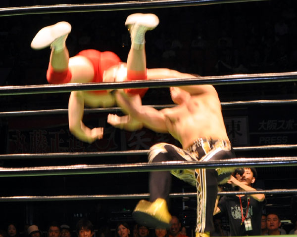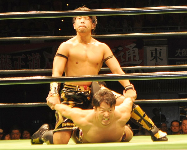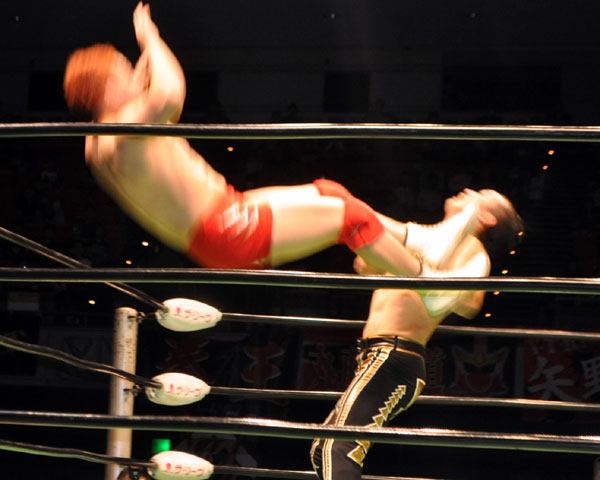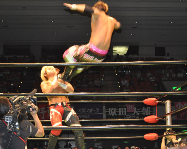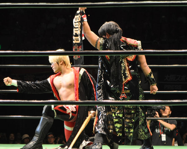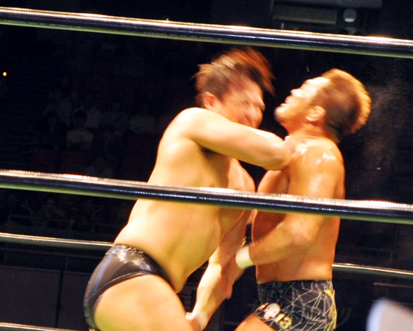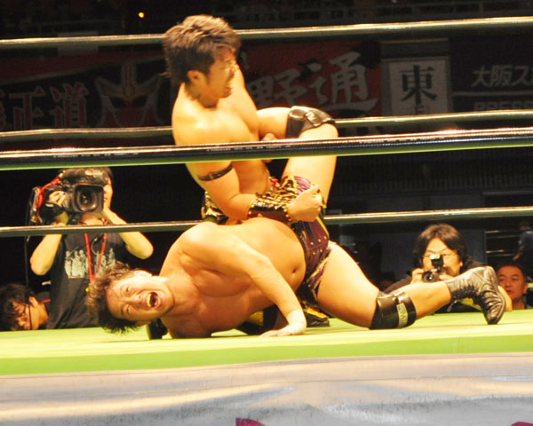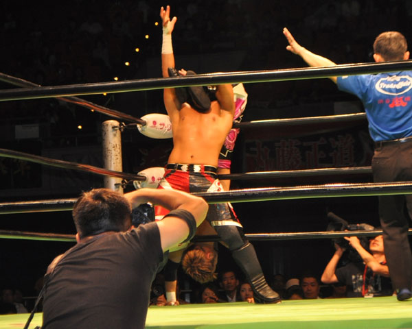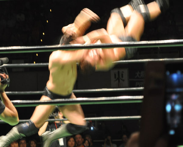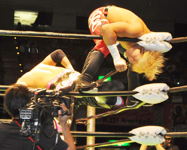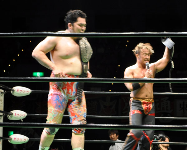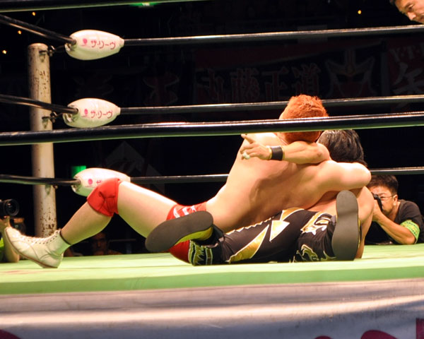 KESはもう1回キラーボムを狙うが、矢野がスミスJr.に急所打ちで阻止し、丸藤は不知火を決め、2発目はアーチャーが回転途中で踏ん張るも、雪崩式狙いを丸藤が雪崩式不知火で切り返し、最後は虎王の連打で3カウントを奪い王座奪取でKESの長期政権に終止符を打つ。ジュニアヘビー級選手権は序盤から熊野が金丸に喰らいついていったが、場外でのボディースラムから金丸が試合の主導権を握り、熊野はなかなかペースがつかめない。