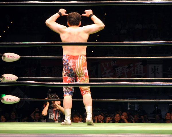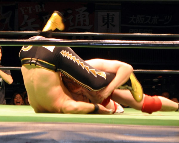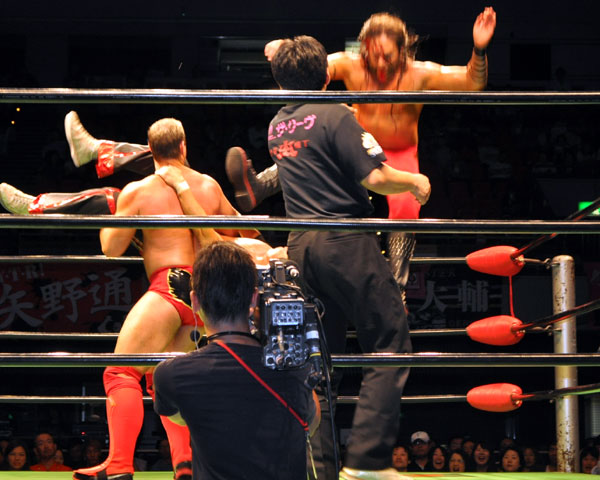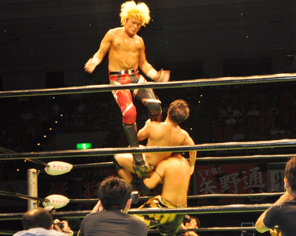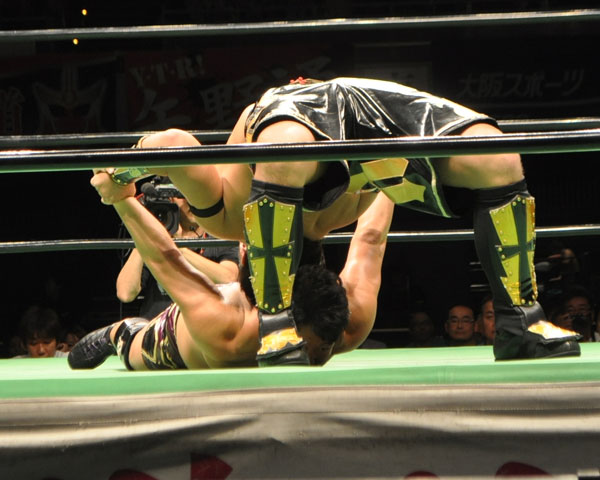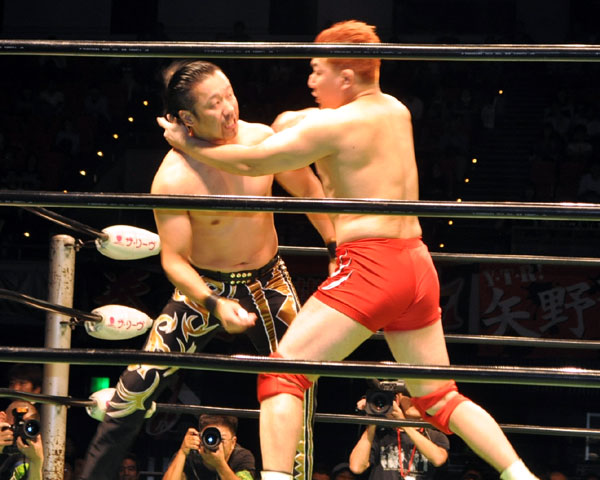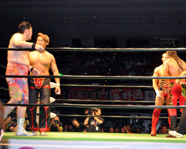 セミのタッグ選手権は矢野が「怖い、怖い」「ブレーク、ブレーク」を連呼しながらアーチャーを翻弄しつつも、KESは丸藤を捕らえて試合の主導権を握るも、アーチャーの悪い癖が出たのかムーンサルトプレスが自爆してしまうと、交代を受けた矢野は崇コーナーにスミスJr.を直撃させ、アーチャーの髪を掴んで倒すなど流れを変えていく。