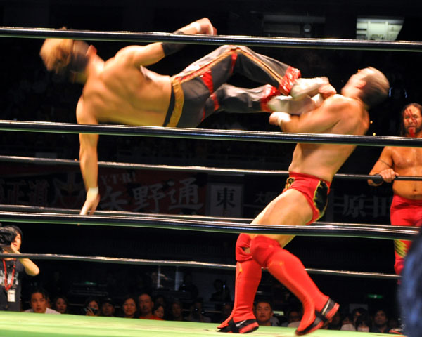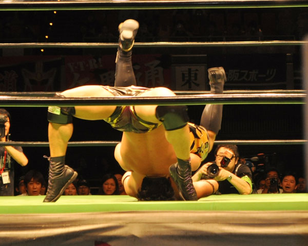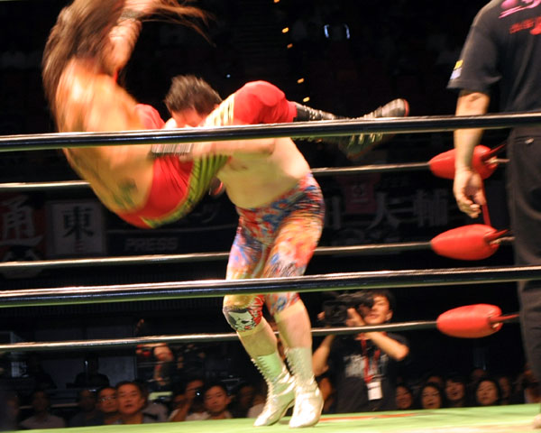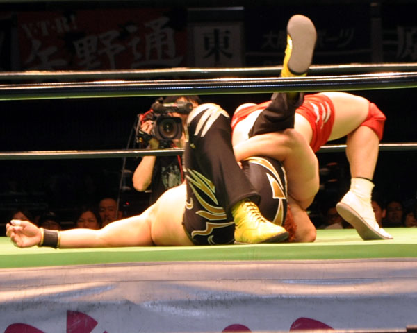 熊野は串刺しバックハンドエルボー、ブレーンバスター、ミサイルキック、フィッシャーマンズスープレックス、チョークスラム式STOまで披露し、新技である変型サイドバスターまで見せるが、金丸はトルネードDDTですぐ自分の流れに変える。