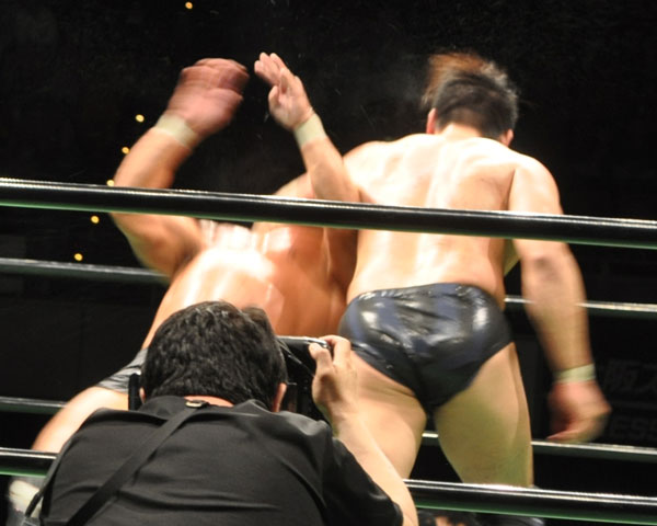 劣勢の田口は回転エビ固めを狙うBUSHIの顔面を低空ドロップキックで捕らえ、ヒップアタックで場外に追いやった後でノータッチトペコンを炸裂、リングに戻ったところで田口は尻をBUSHIの顔面に擦り付けてからヒップアタック連射、ランニングヒップアタック連射。そこからリングを降り、場外からドロップキックと攻勢をかけ、スリーアミーゴズも3回目でBUSHIが着地するが、田口はアンクルホールドで捕獲する。