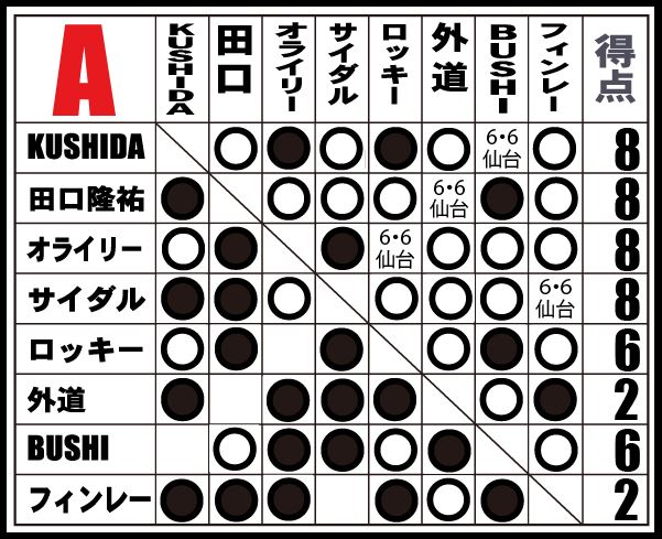 [4勝2敗=8点]○KUSHIDA(15分59秒 ホバーボードロック)[4勝2敗=8点]×マッド・サイダル(試合終了後)