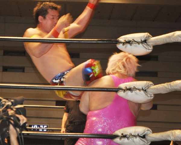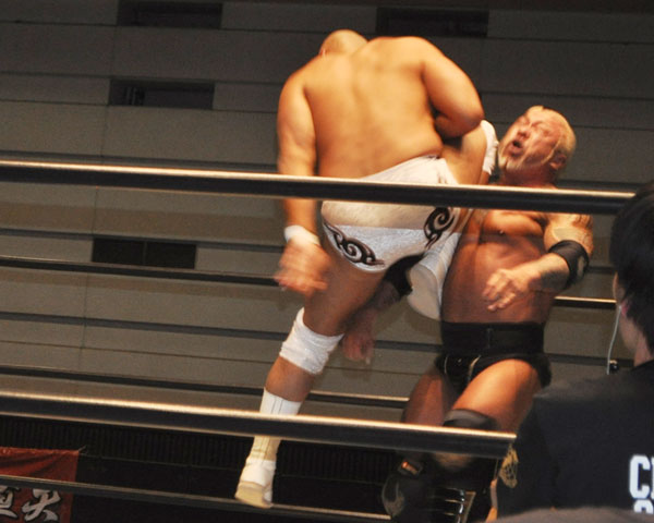 第3試合の秋山vsボディガーはボディガーが奇襲を仕掛けてラリアットで速攻勝負狙いも、秋山が場外に逃れて追いかけたボディガーを場外エクスプロイダーで投げて応戦する。