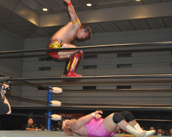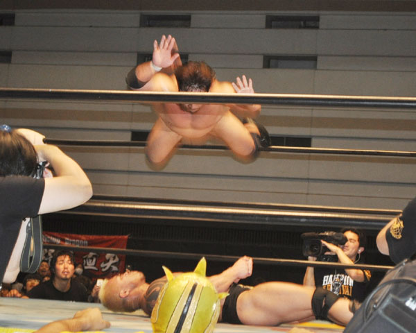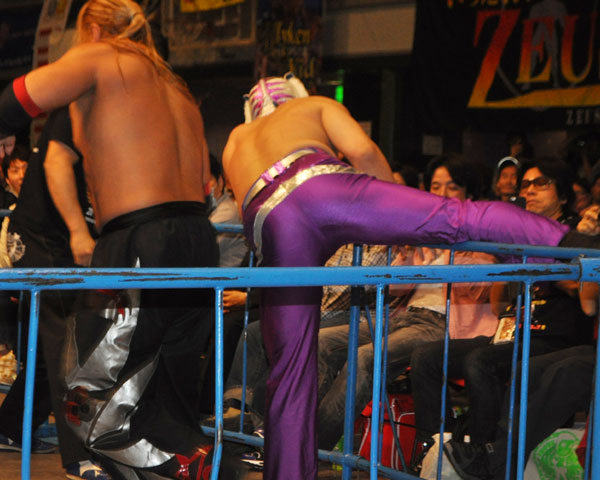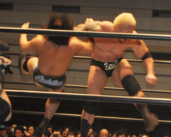 ゼウスはバイセップスエクスプロージョンで関本を場外へ追いやるとノータッチ式プランチャを炸裂させ、場外でのブレーンバスター、リングに戻ってから串刺しボディアタック、フロントスープレックス、ジョン・ウーと攻め立て関本を追い詰める。