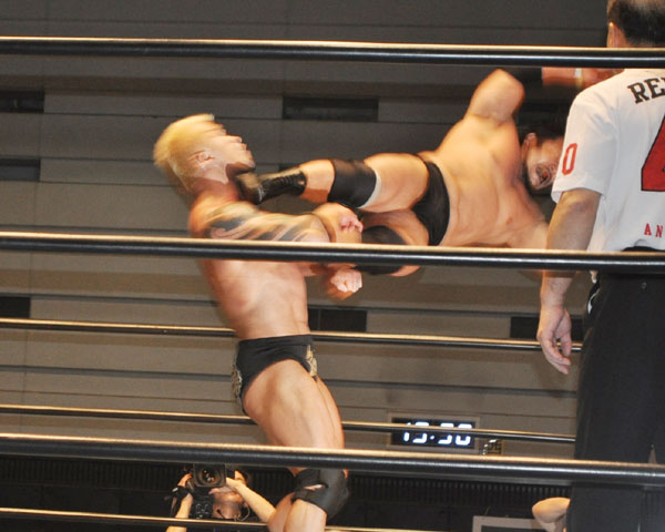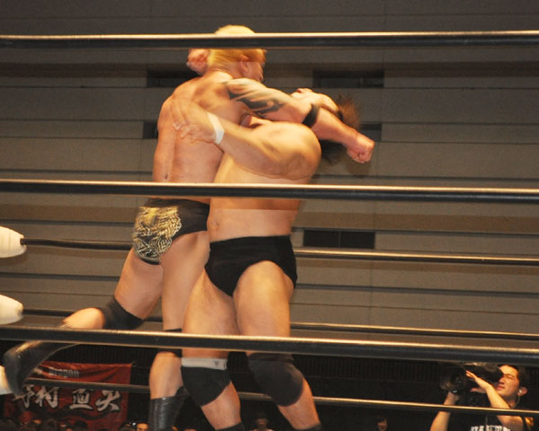 ゼウスは再度ジャックハマーを狙うが、関本は逆に垂直落下式ブレーンバスターで突き刺すと、投げ放しタイガースープレックスを敢行、後ろ前へとラリアットを炸裂させる。