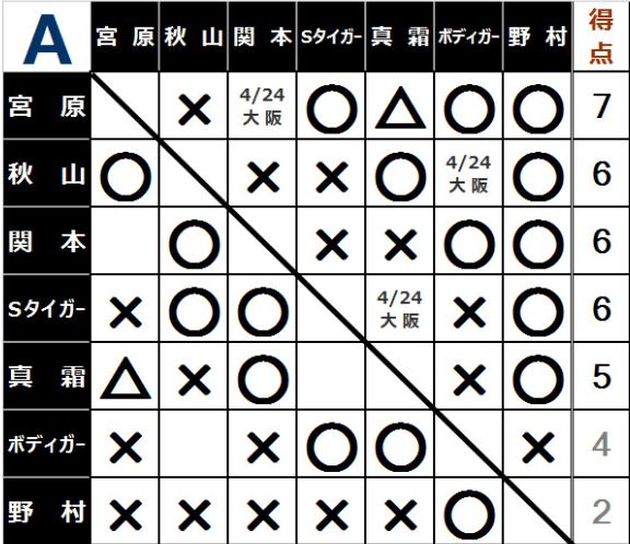 [2勝=4点]○潮崎豪 マイバッハ谷口(11分18秒 片エビ固め)[1勝1敗=2点]モハメド ヨネ Xクワイエット・ストーム