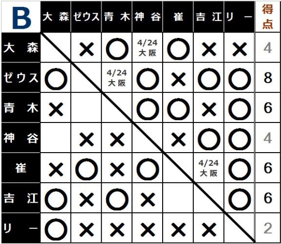 Bブロックは1位がゼウス、2位に青木、崔、吉江が追いかける展開。ゼウスは青木との直接対決を制すれば優勝決定戦へ進出、負けと崔vs吉江の結果次第では巴戦の可能性もあるため、青木戦は絶対に落とせない(PWFルールでは同点の場合優勝戦進出決定戦を行う)