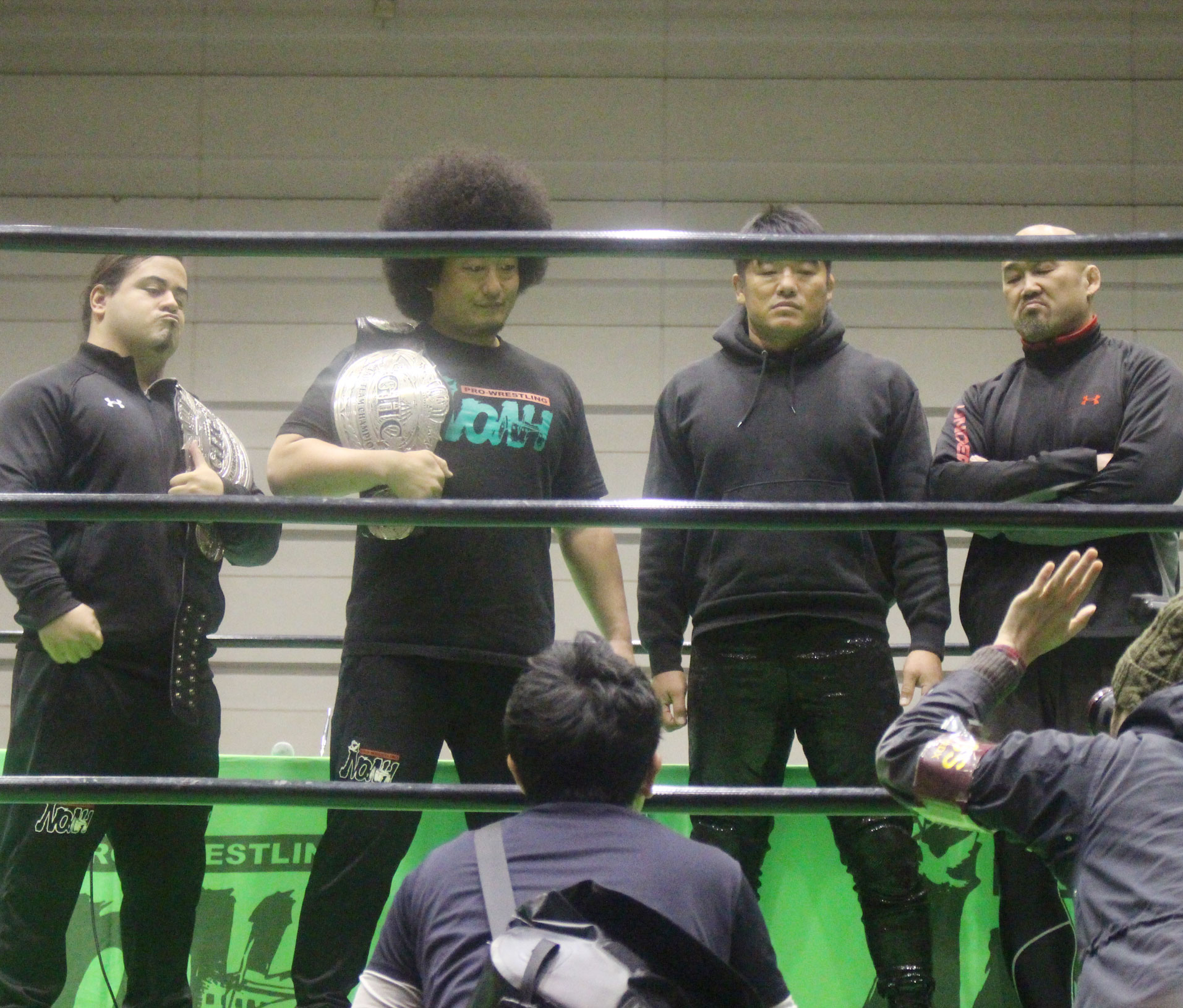 原田。「同じや…って言うだけやろ。このリング、お笑いは一切必要ないぞ。このリングは闘うリングやぞ? お前がこのベルトに挑戦したい。HAYATAもこのベルトに挑戦したい。それやったらお前ら二人でシングルマッチしろ。勝ったモンと俺がこのベルト懸けて勝負したろうやんけ( 熊野とHAYATAがにらみ合ってから下がる)皆さん本日は寒いなか、たくさんのご来場、ありがとうございました。HAYATAが来ても、熊野が来ても、俺は絶対このベルトを防衛して、またここ大阪に帰ってきます。あとひとつだけ、今日ここの会場に来てくれた人と約束したいことがあります。今日は2018年最初の大阪大会でした。たくさんの人が観にきてくれました。でも、まだまだイスは並べられます。立ち見だって出せます。俺は今年中に絶対、この会場を超満員札止めにしてみせます。いつまでも、ここエディオンアリーナの階段を下りて会場入りするのは悔しいです。(※第2競技場は地下にある) いつか必ず…とは言いません。来年には必ず、プロレスリング・ノア、エディオンアリーナの第1競技場でやらせてみせます。だから皆さん、このエディオンアリーナの階段、一段一段、一緒に昇って第1競技場でプロレスリング・ノア、やりましょう!! 俺は嘘つきなんかにはならない。絶対やってみせますんで、皆さん応援よろしくお願いします! 今日は最後までありがとうございました!!」