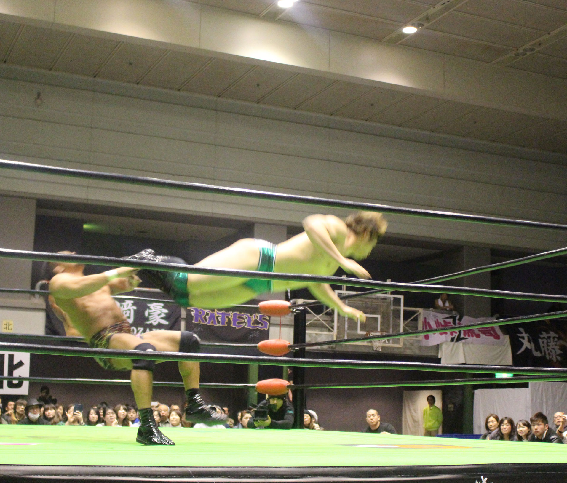 セミのジュニアタッグ選手権は王者のRATEL'Sが連係でHi69を捕らえるも、挑戦者のXXも石森のスワンダイブ式雷電ドロップで反撃してからHAYATAを捕らえて主導権を握る。しかしRATEL'SはYO-HEYに交代すると、YO-HEYがスピードでXXを翻弄、だがHi69に狙ったけてツイストオブフェイトが逃れられると、石森はRATEL'Sをまとめてスタナー&DDT、YO-HEYにリバーススプラッシュ式フットスタンプからハンドスプリングエルボーを狙う。ところがYO-HEYがドロップキックで迎撃すると、HAYATAがローリングセントーンからハンドスプリングエルボー、YO-HEYもミサイルキックで続き、HAYATAが入って石森にトータルレンジャーから合体ツイストオブフェイト、そしてバンブードラゴンフライを投下も、かわされて自爆となってしまう。