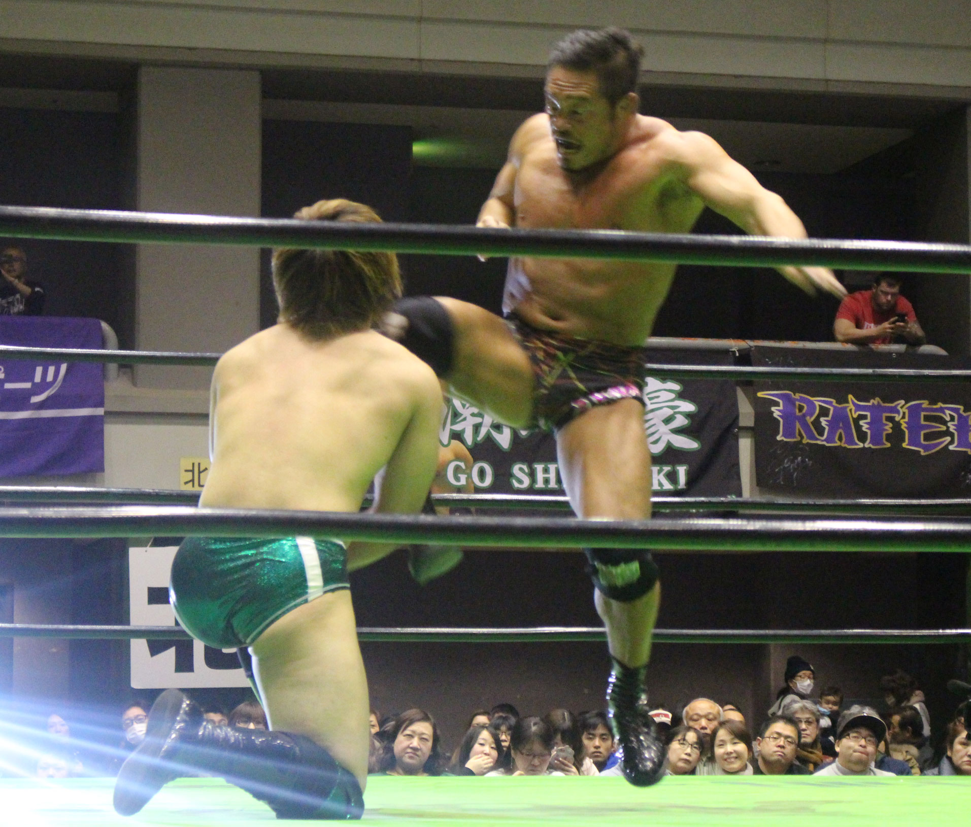 第5試合の杉浦vs清宮は、杉浦相手にエルボー合戦に競り勝った清宮はプランチャを発射も、場外戦で杉浦がビックブーツから鉄柵攻撃で反撃、エルボー合戦も清宮は引かなかったが、杉浦はビックブーツからサッカーボールキック、腰へのエルボーと腰攻め。それでも清宮はドロップキックで反撃し串刺しエルボーの連打、ミサイルキックと反撃も、杉浦は斜めからのスピアー、串刺しビックブーツ、串刺しニーの連続攻撃、雪崩式ブレーンバスターから逆エビ固めで捕獲する・