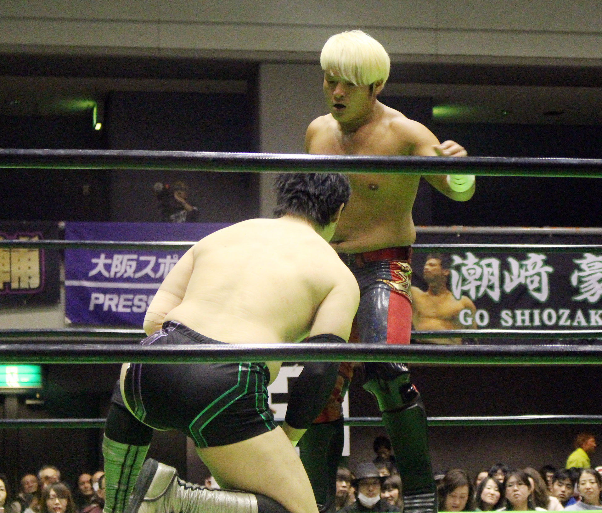 大阪大会はジュニア二大タイトルマッチが組まれ、まずメインはGHCヘビー級王者の原田に大原が挑戦、昨年1月の大阪大会も同一カードが組まれ、この時は大原が王者で原田が挑戦者という図式だったが、今年は立場が入れ替わっての対戦となった。
