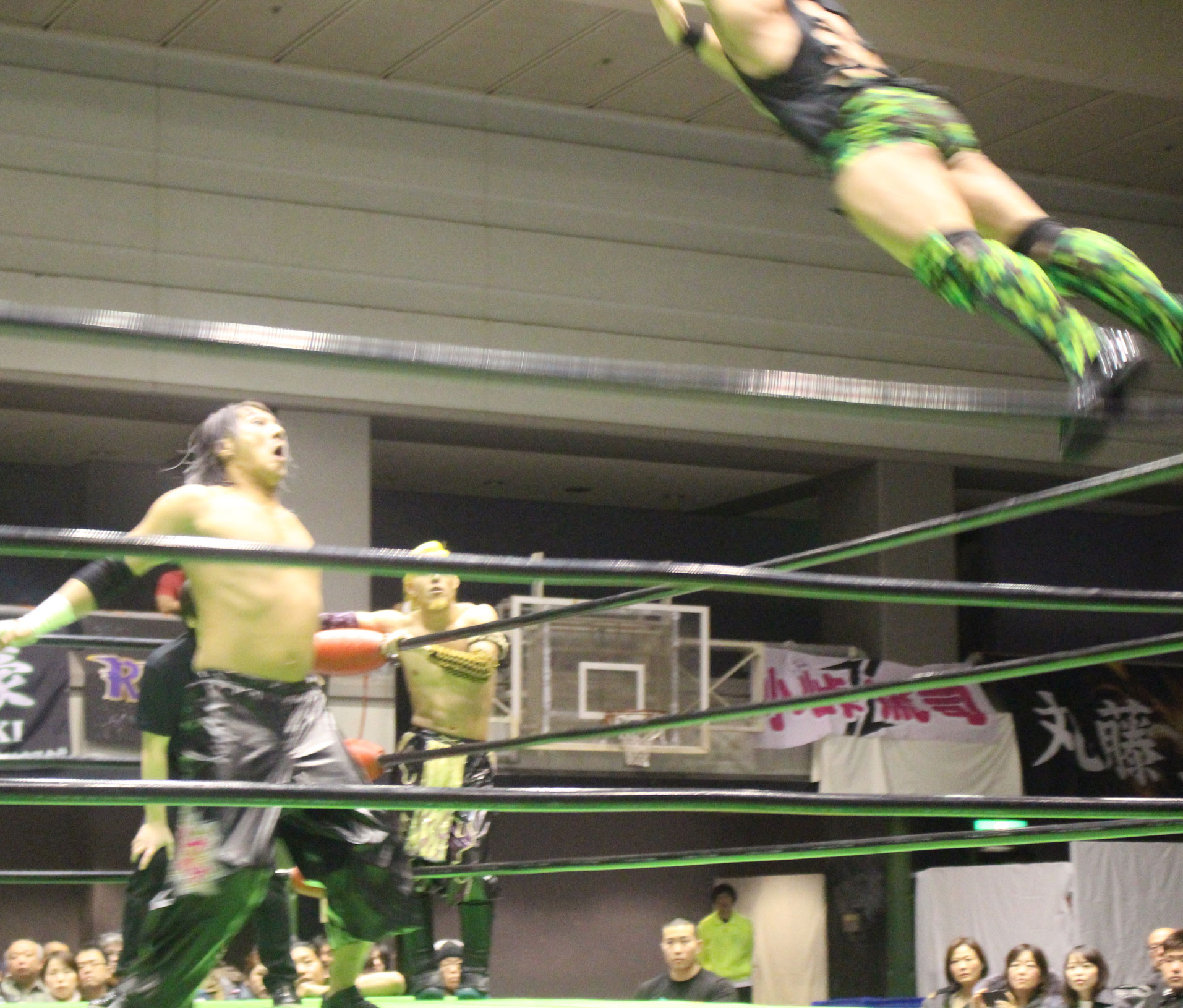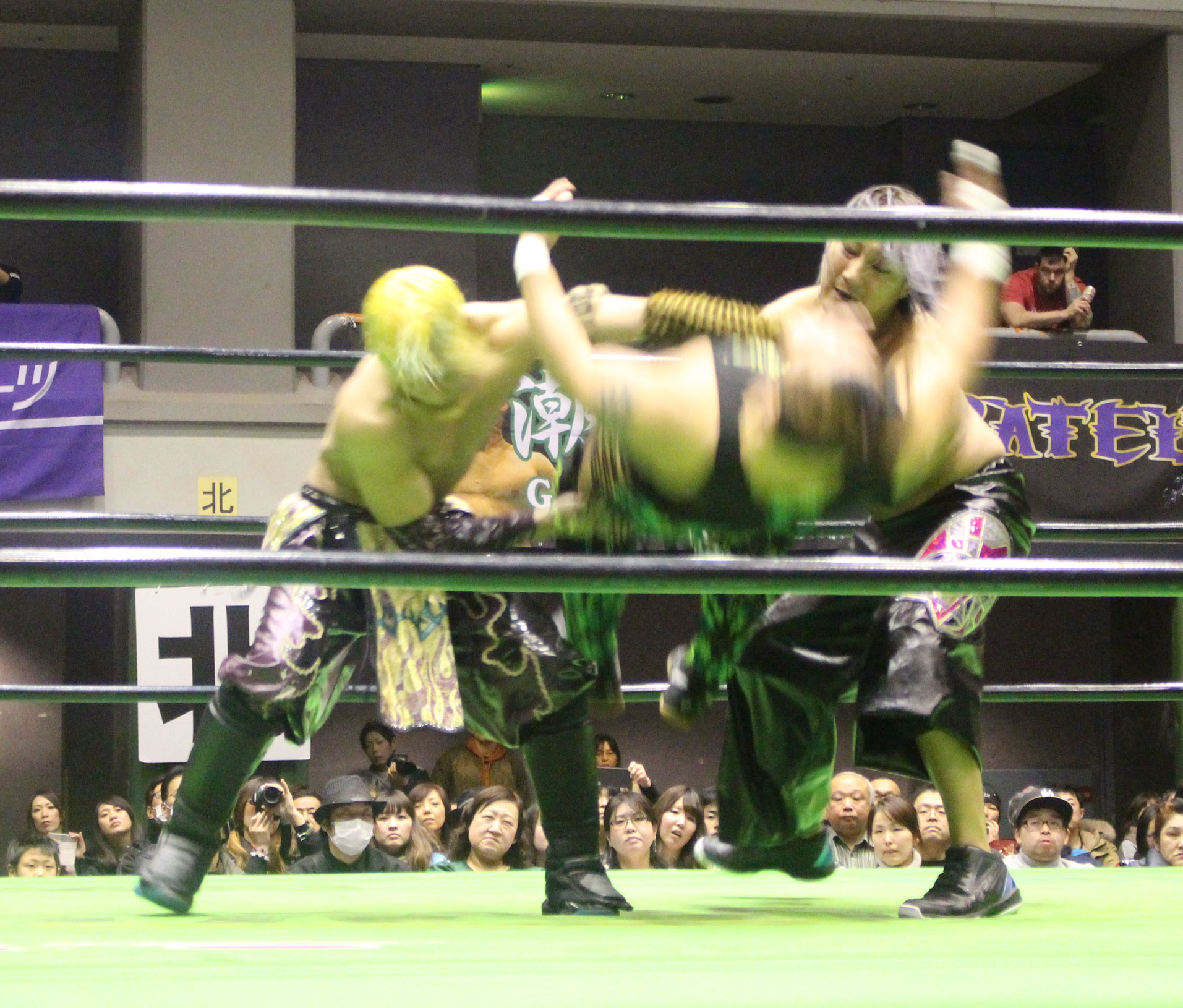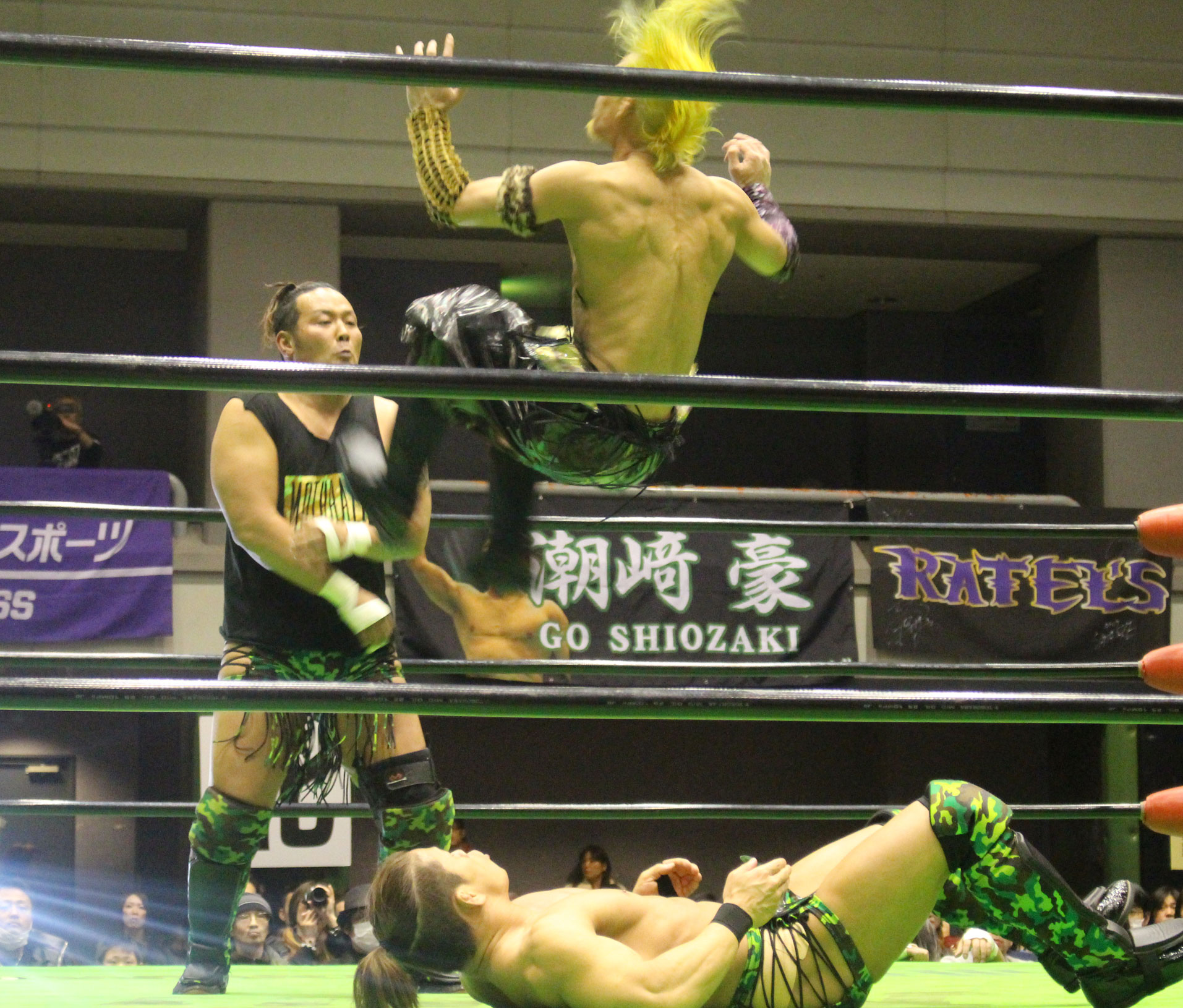 ここで交代を受けたHi69はYO-HEYにトランスレイブからみちのくドライバーで突き刺すと、ストゥーカ・スプラッシュを投下するが、YO-HEYは剣山で迎撃し、ソバットから突進するHi69に顔面Gを炸裂させてから、スーパー顔面Gを投下、だがHi69がかわすと、石森が入ってダブルトランスレイブ、ダブルエキサーII狙いはHAYATAがカットに入るも、石森はYO-HEYをセカンドロープ上にセット。場外めがけてスライディングしながら足をすくって後頭部を叩きつけ、石森の450°スプラッシュで勝負に出るが、かわされて不時着した石森にHAYATAがみちのくドライバーで突き刺す。