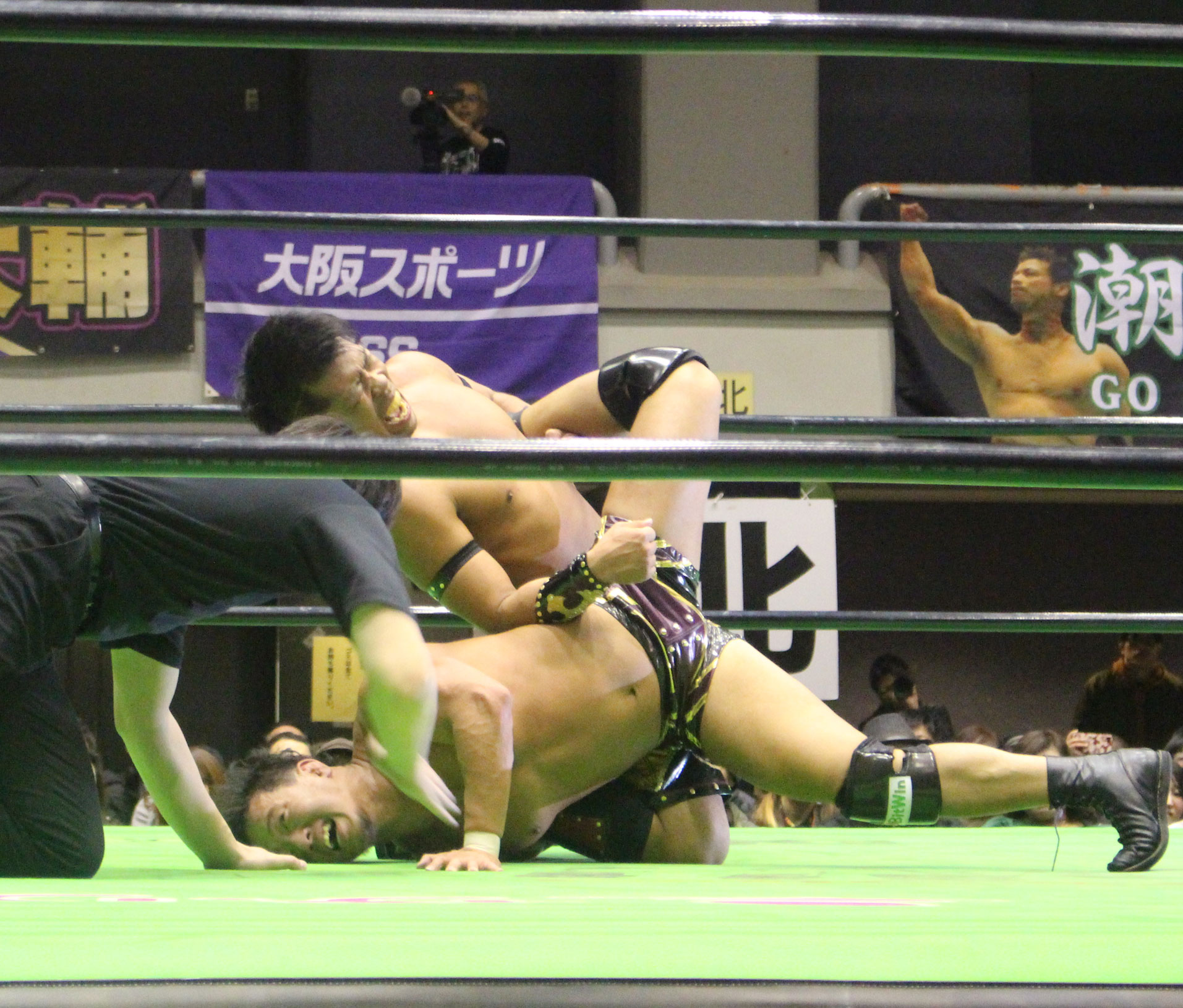 勝負に出た原田はニーアッパーから片山ジャーマンを決めるが、大原はカウント2でキックアウトし、原田が突進すると今度は大原が旋回式エメラルドフロウジョンを決めると、ターンバックルめがけてのバックブリーカーを敢行、肩乗せ式のバックブリーカー、前方旋回式バックブリーカーと腰攻めからムイビエンで捕獲も、脇腹攻めが充分に聴いていたせいか完全には極めきれずロープに逃れられてしまう。